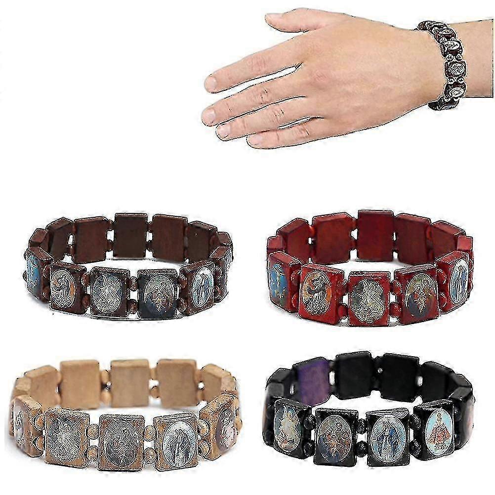 4pcs Wooden Rosary Jesus Bracelet Elastic Stretch Bracelet with Religious Saints Images Catholic Holy Spirit Goddess Prayer Manifestation Br