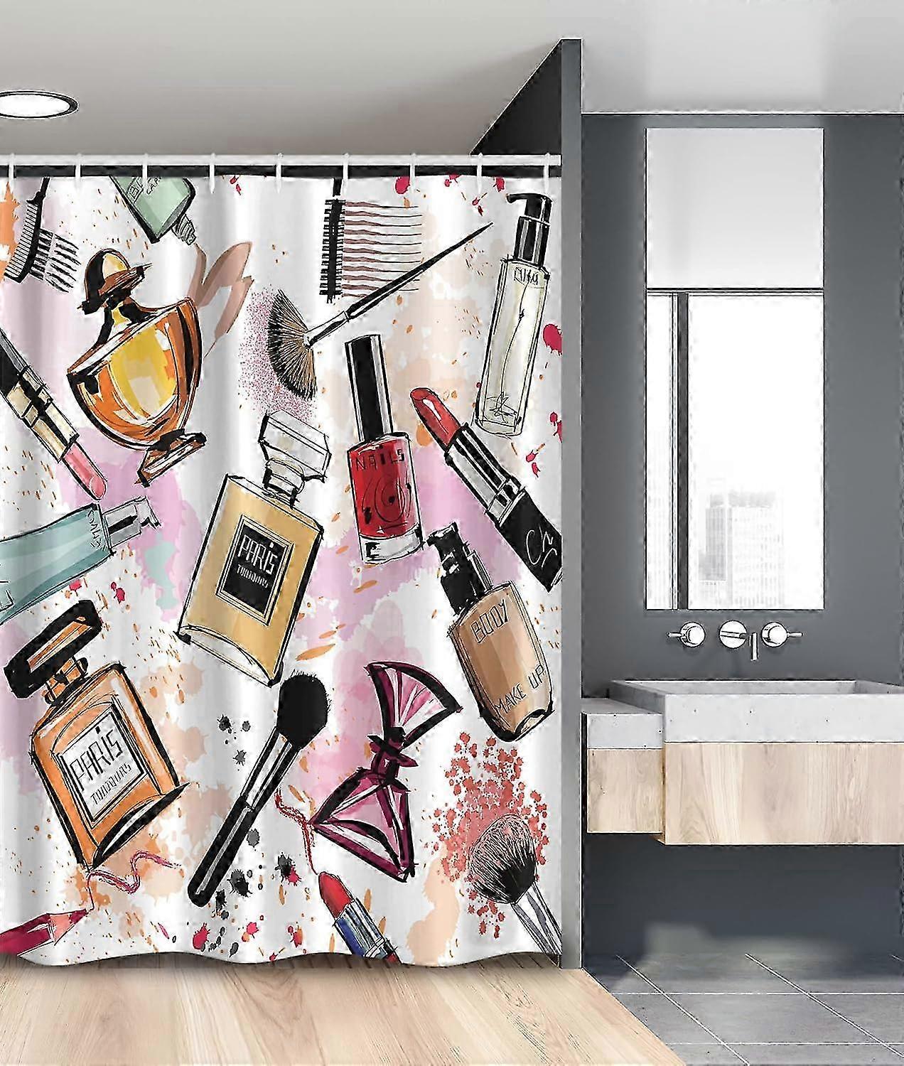 Fashion Shower Curtain, Cosmetic And Makeup Theme Pattern Perfume Lipstick Nail Polish Brush Modern, Fabric Bathroom Decor Set With Hooks,multicolor W