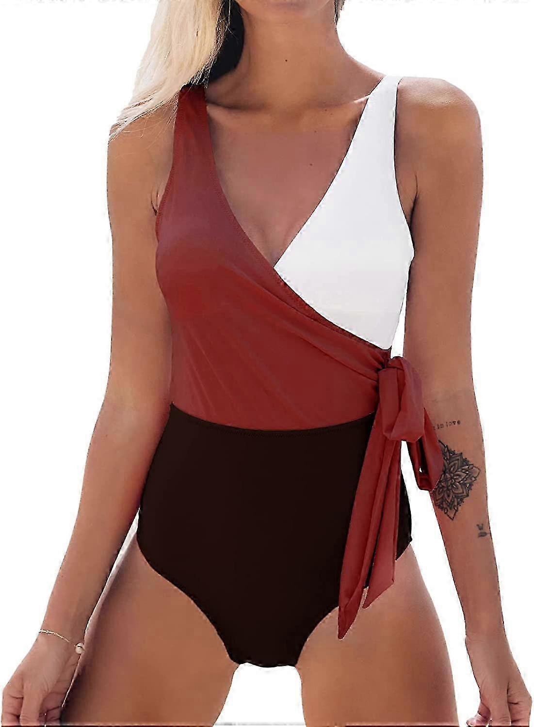 Women's One Piece Swimsuit Wrap Over Swimwear Knotted Color Block Bathing Suit Swimming Costume 25-26
