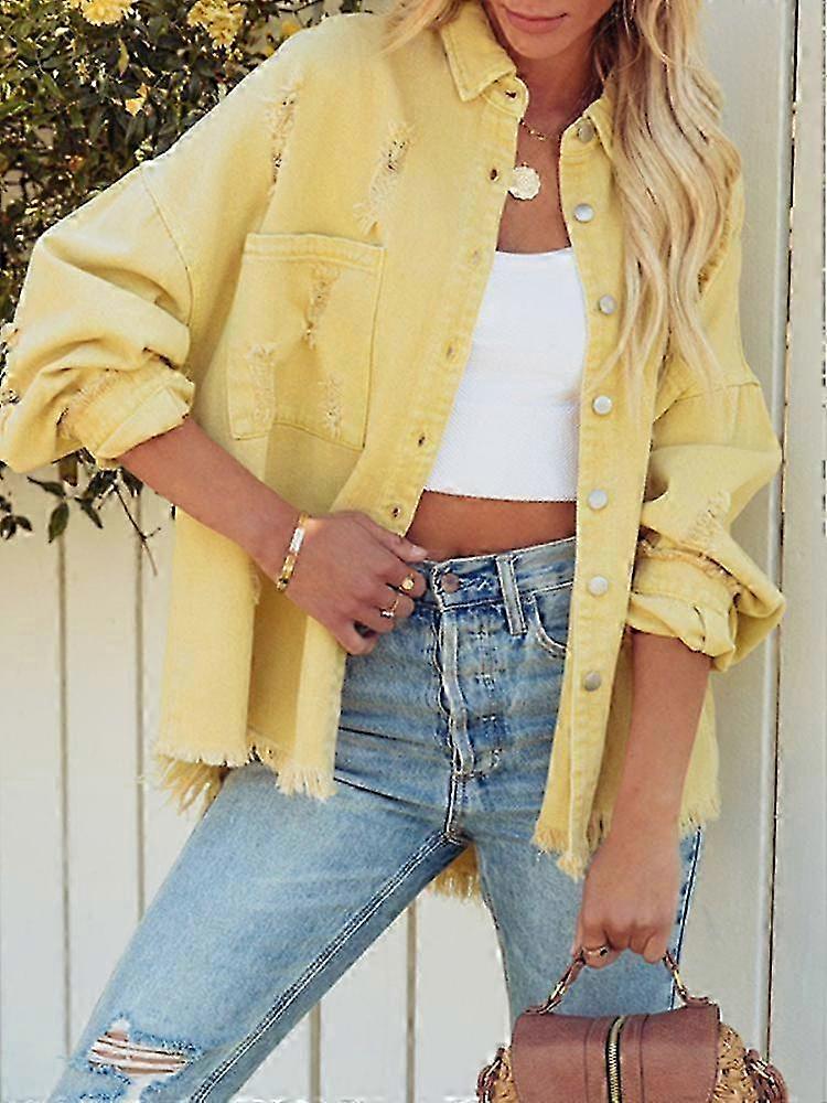Women Denim Jacket Ripped Turn Down Collar Long Sleeve Tops With Pockets Single Breasted Tassels Coat Loose Outwear 25-26s
