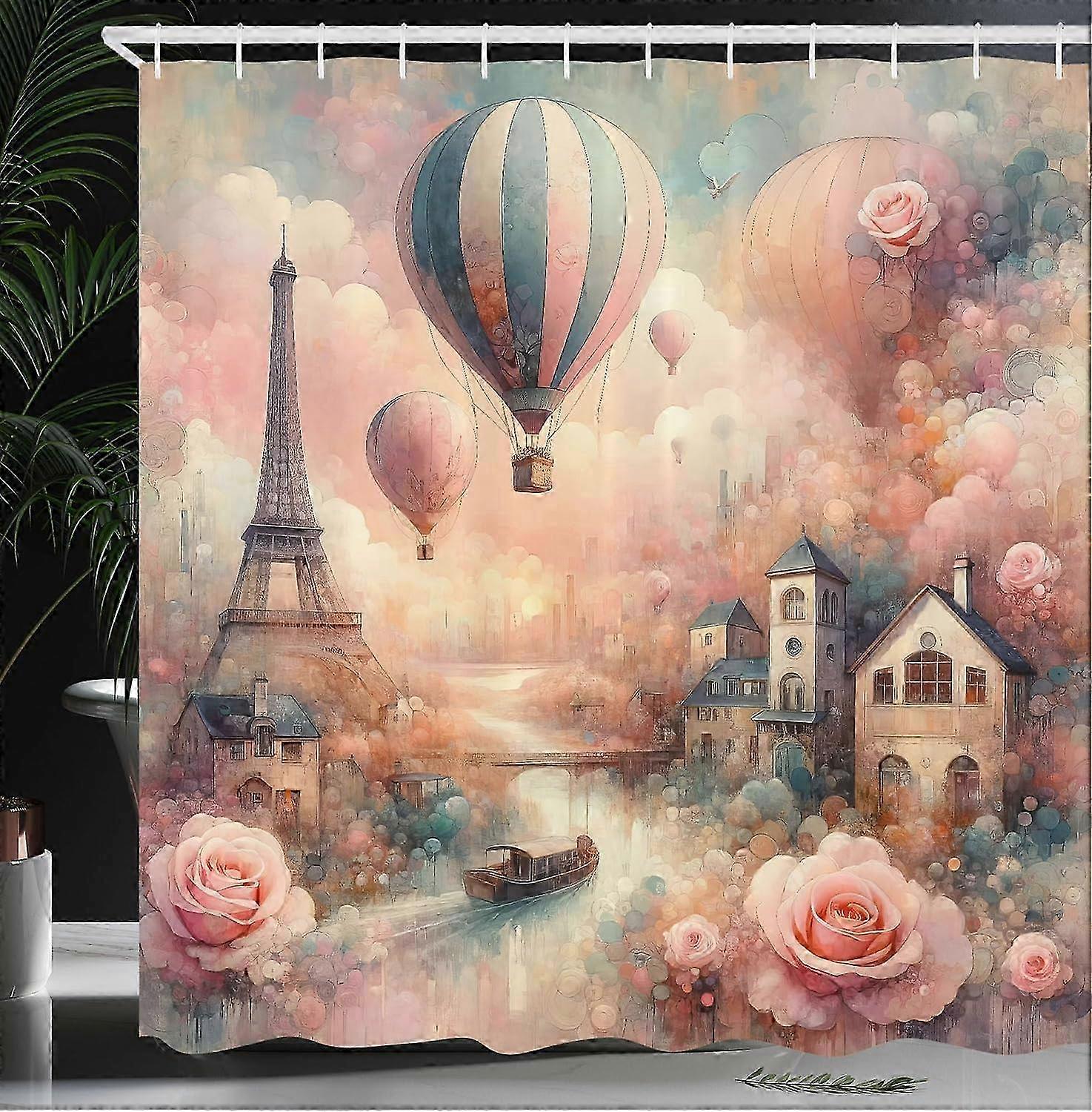 Pink Shower Curtain, Blush Tone Atmosphere Dreamy Paris with Flowers Balloons and Eiffel Tower, Cloth Fabric Bathroom Decor Set with Hooks 2