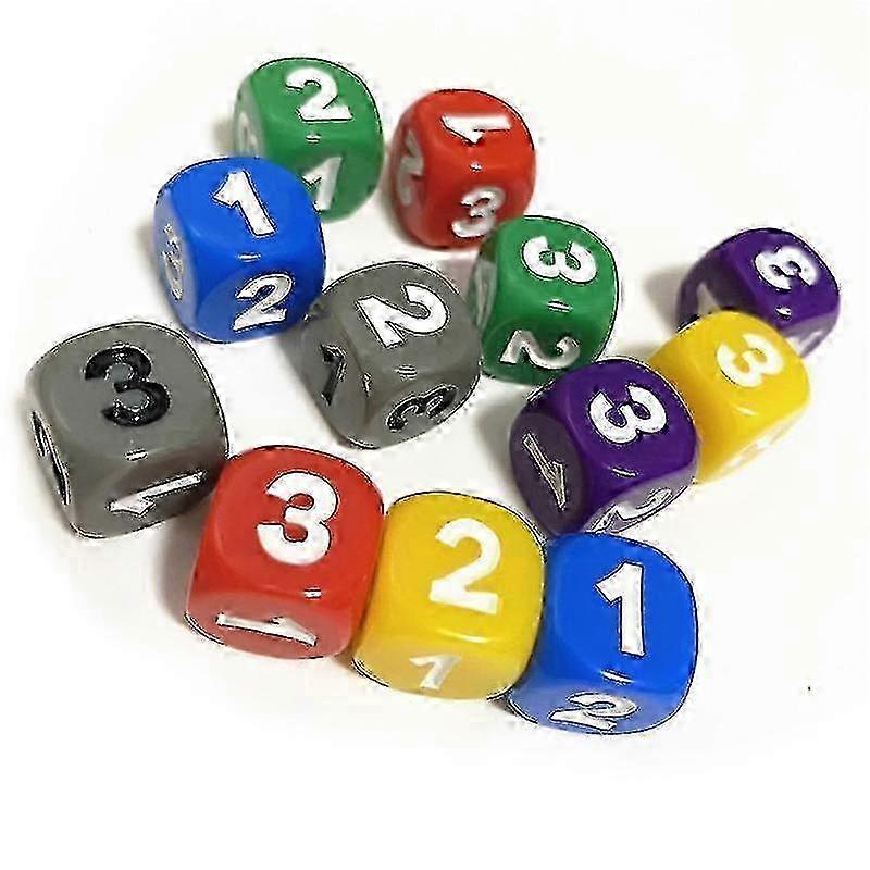 Size :14*14*14mm 6 Colors like in the picture This style dice is a Special style, there just have the number 1,2,3 in all its 6 faces. Package include:10 pieces Dice Note: 1.Please allow 0.1-0.3mm error due to manual measurement. 2.Due to the difference between different Monitors, the picture may not reflect the actual color of the article. We guarantee the style is the same as shown in the pictures.Thank you Note: Due to the light and screen setting difference, the item's color may be slightly different from the pictures. Please allow slight dimension difference due to different manual measurement.