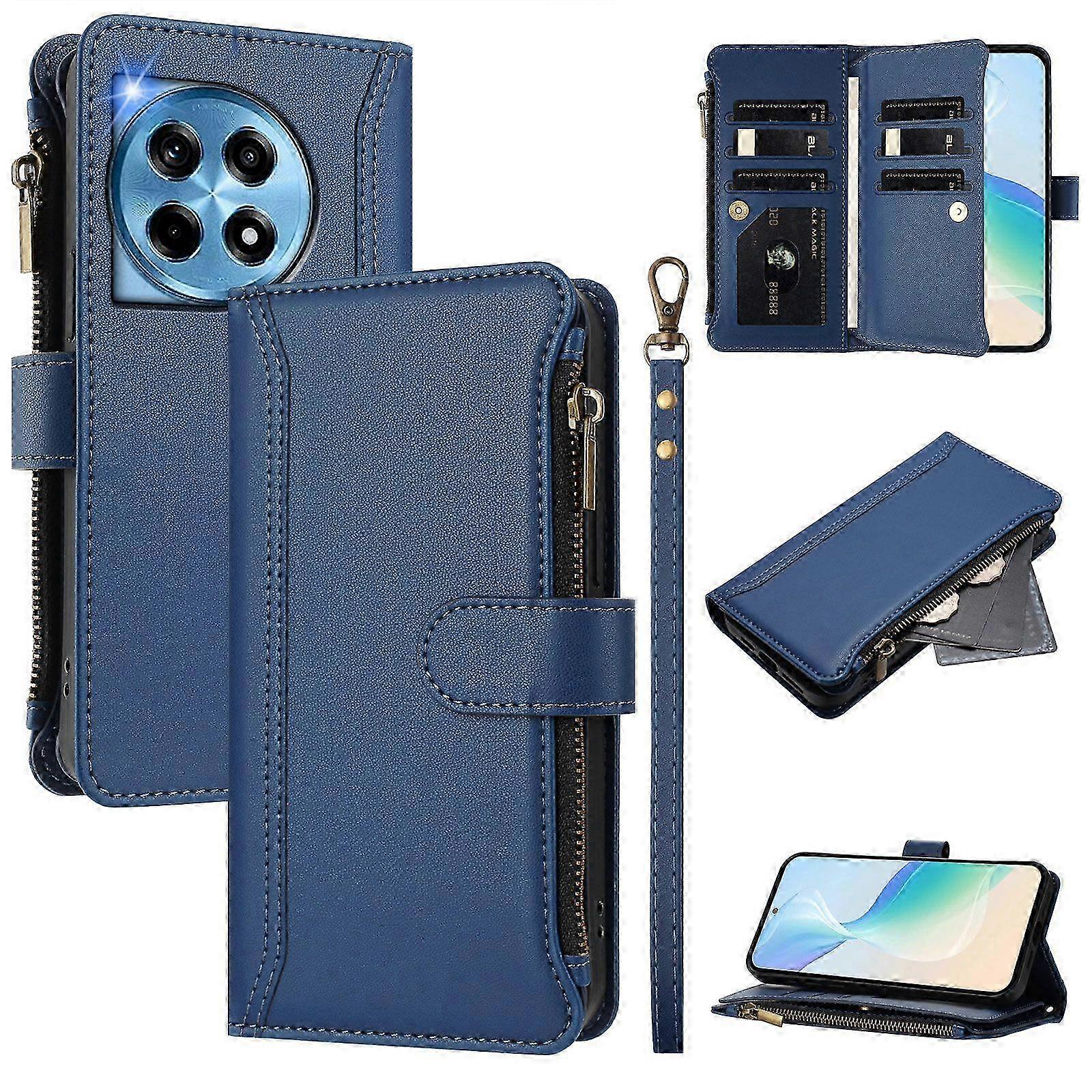 25-26 For OnePlus 12R 5G Leather Case 9 Card Slots Zipper Wallet Stand Phone Cover with Wrist Strap