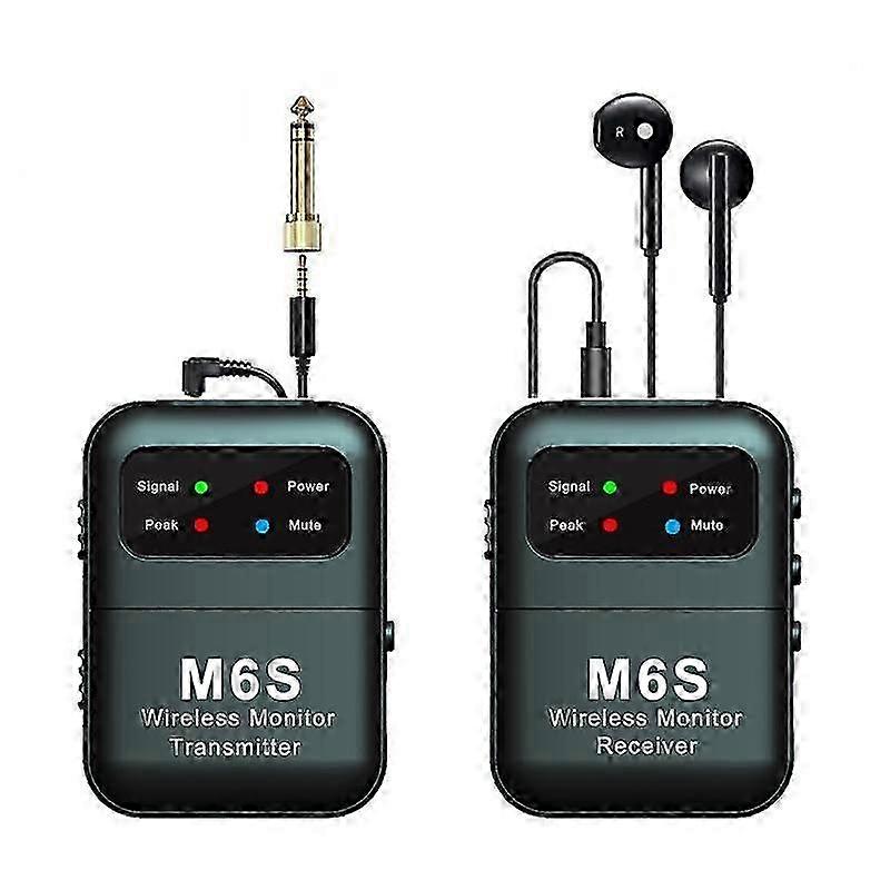 M6S Stereo Wireless In-Ear Monitor System 2.4G Transmitter & Receiver 1. Adopt 2.4 GHz frequency band chip, it is a low-noise, low-latency, dual-channel stereo intelligent wireless monitoring system 2. Automatic pairing: The wireless transmitter and receiver can be paired automatically after turning on the power, without manually changing channels, until the green light stops flashing pairing is successful. 3. The transmitter and receiver are built-in rechargeable large-capacity lithium batteries, which can work last for 8 hours after being fully charged. 4. Multiple receivers can be paired with one transmitter at the same time. 5. Frequency response range: 20-20kHz 6. Transmission distance: 80 feet (unobstructed), 40 feet (through walls) 7. Latency: less than 8ms 8. SNR: -98dB 9. Dynamic range: more than 105dB 10. Battery capacity: 500mAh 11. Charging interface: Type-C Note: Due to the light and screen setting difference, the item's color may be slightly different from the pictures. Please allow slight dimension difference due to different manual measurement.