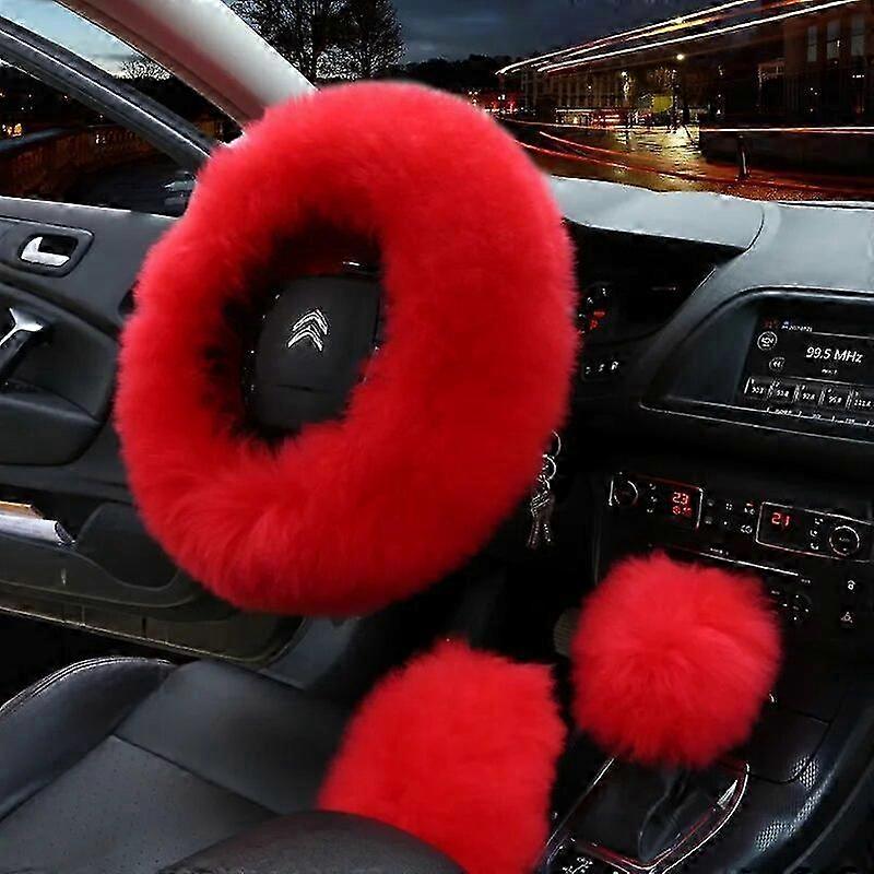 25-26 3PCS Set Real Wool Fur Soft Steering Wheel Covers Furry Long Hair Womens Winter Fashion Handle Cover Car Decoration Accessories
