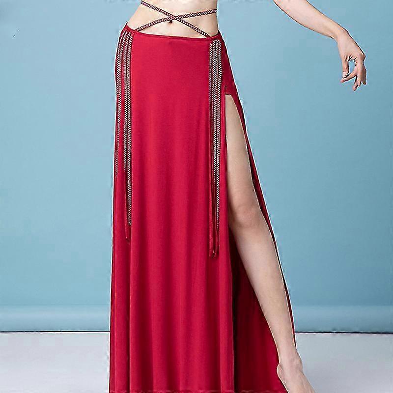 26-27 Women Chinese Style Dance Costume Performance Belly Dance Costumes 2pcs Clothing Hot Drilling Sexy Split Long Skirt Suitwine Red Skirt