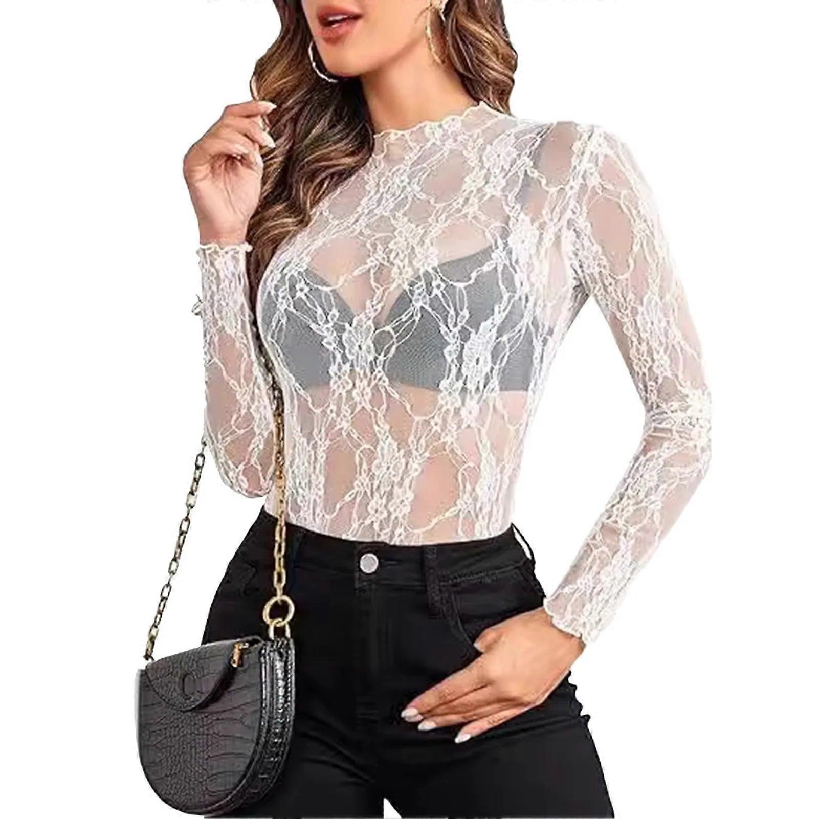 Women's Sheer Mesh Long Sleeve O Neck Blouse Slim Fit Sexy Top