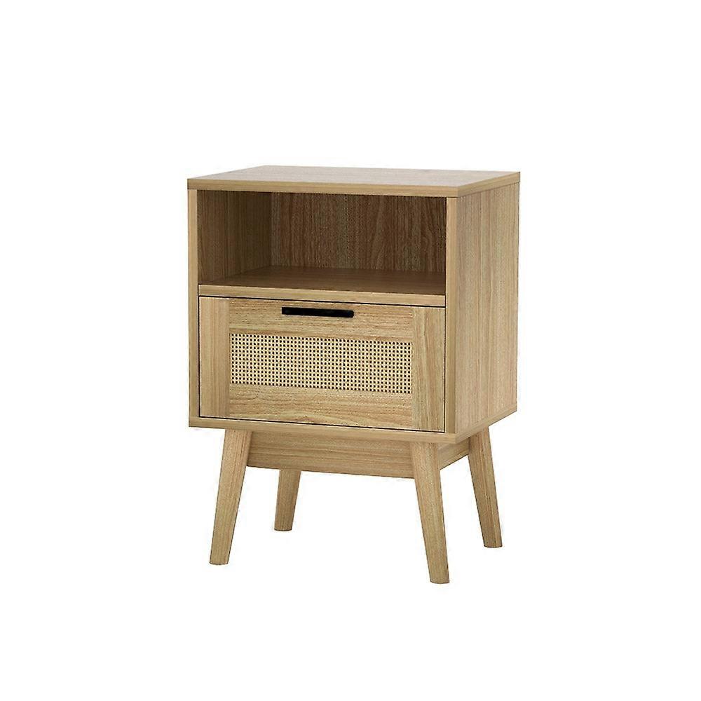 Lending A Unique Character To Any Bedroom Aesthetic Our Artiss Rattan Bedside Table Enables You To Achieve A Seaside Cottage Look Effortlessly. Its Intricate Rattan Detailing Draws The Eye To Its Impeccable Craftsmanship. Flaunting Crisp Light And Breezy Style Our Rattan Bedside Table Will Complement Your Boho-Inspired Bedroom Decor. It's Crafted From Thick A Particle Board With Paper Finish Making It Sturdy Durable And Attractive And The Solid Wood Legs Are Well-Proportioned Stable And Durable. Plus The Floor Protectors Attached To Its Legs Keep Your Floors Safe And Scratch-Free. Our Rattan Bedside Table Has A Spacious Drawer And An Open Display Shelf With Sleek Aluminium Handles And Smooth Metal Runners. It Has Ample Storage Space To Keep Your Vases Stylish Houseplants Photo Frames Bedside Lamps Night-Time Essentials And Other Decorative Pieces. Artiss Rattan Bedside Table Is More Than Just A Bedroom Stunner. Without Any Further Thought Bring Home This Exceptional Piece Of Furniture Today.