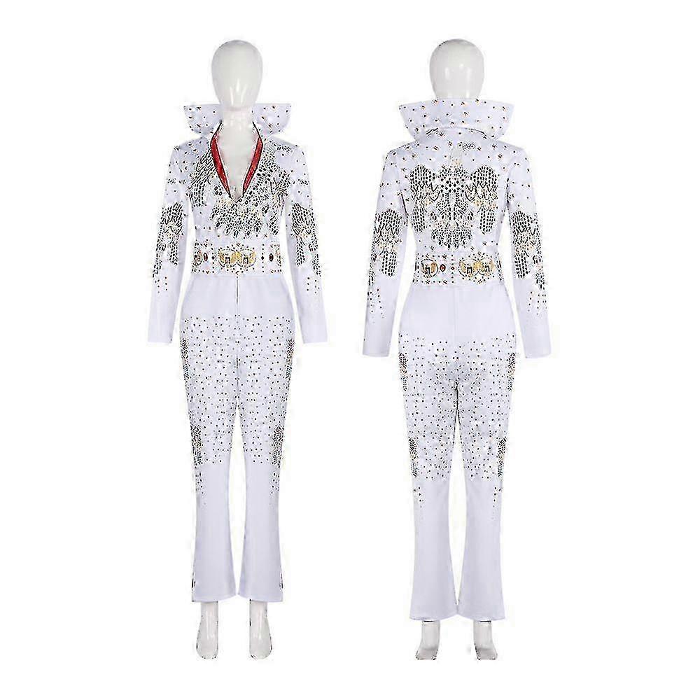 2025 WomenS Elvis Presley Costume Costume Set Cosplay Outfit White Rhinestone Jumpsuit With Eagle Print For Tribute & Party With Detailed Accessories