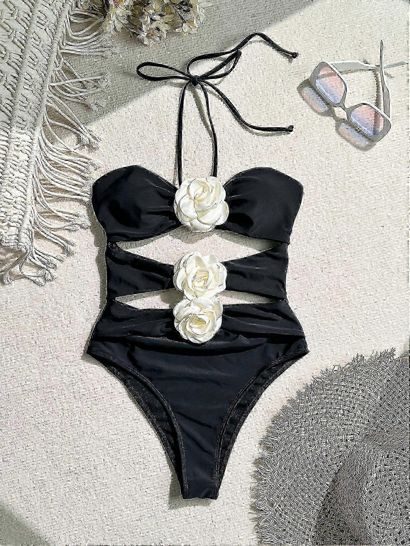 2025 Women's Black Cutout One-Piece Swimsuit 3D White Rose Halter Monokini Elegant Floral Swimwear