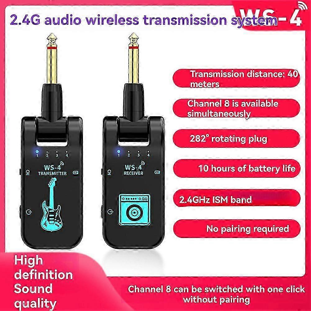 WS-4 2.4G Wireless Guitar System Transmitter Receiver for Electric Guitar & Bass, 48K High-Def Audio, 8 Channels, 40m Range, 10H Battery, Plug & Play