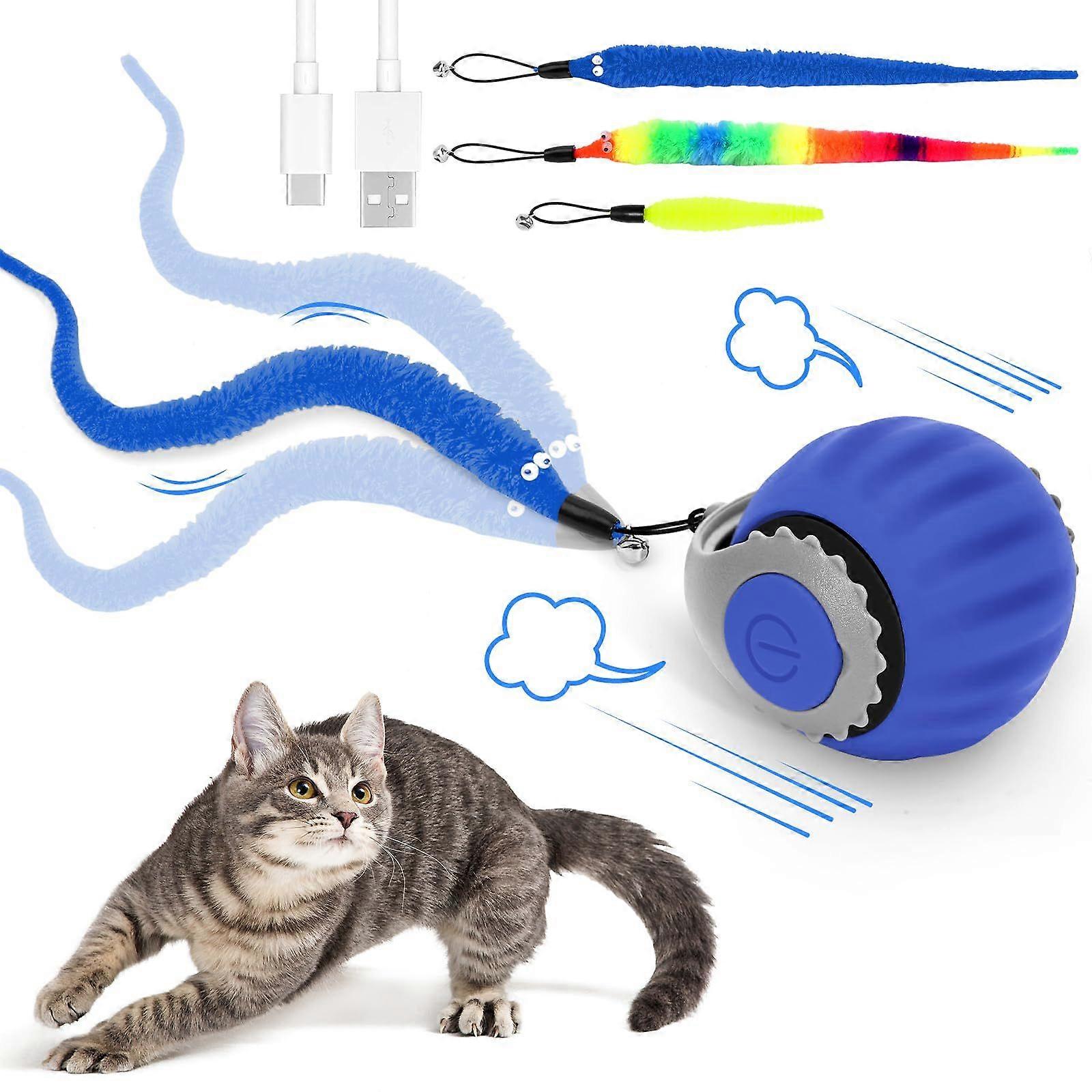 Cat Toy, Interactive Ball Toy for Cats, Indoor Cat Toy, with Fluffy Tail, Automatic Rolling Ball for Cats and Dogs, USB Charging (Blue)