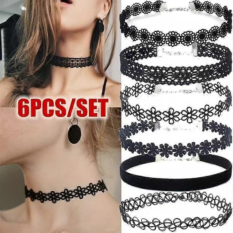 6Pcs/Set Black Lace Chokers Necklace Set Vintage Gothic Punk Elastic Necklace Women'S Jewelry Adult/Child Size