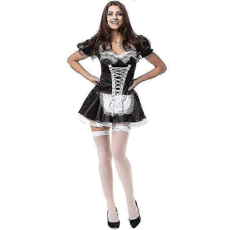 Women's French Maid Costume Sexy Black Satin Halloween Fancy Dress 25-26