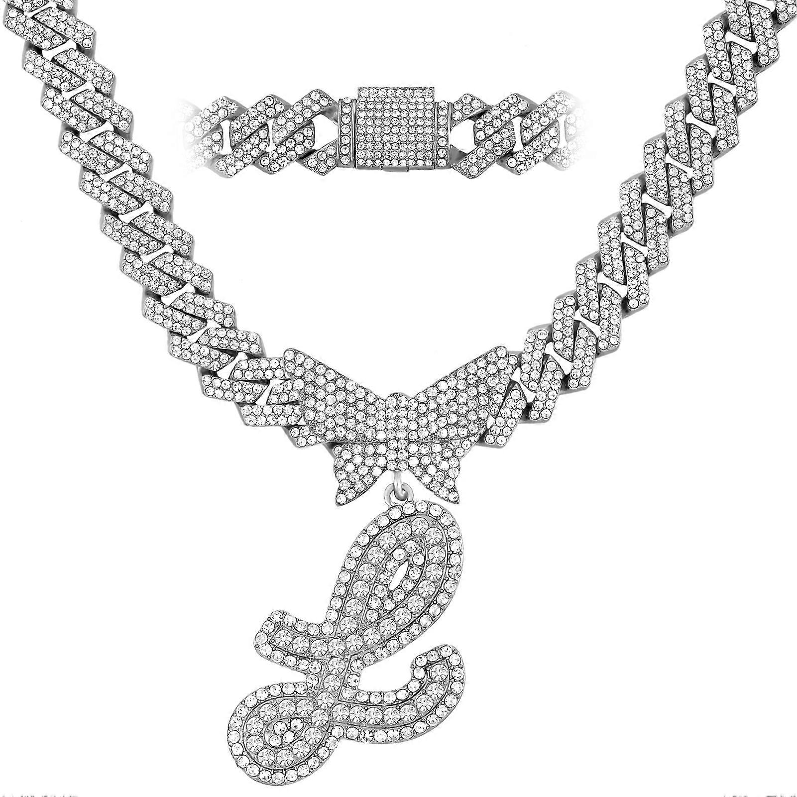Men Women 14MM Cuban Chain Crystal Butterfly Initials Name Pendant Necklace Iced Out Cursive Letters Rapper Necklace Jewelry New
