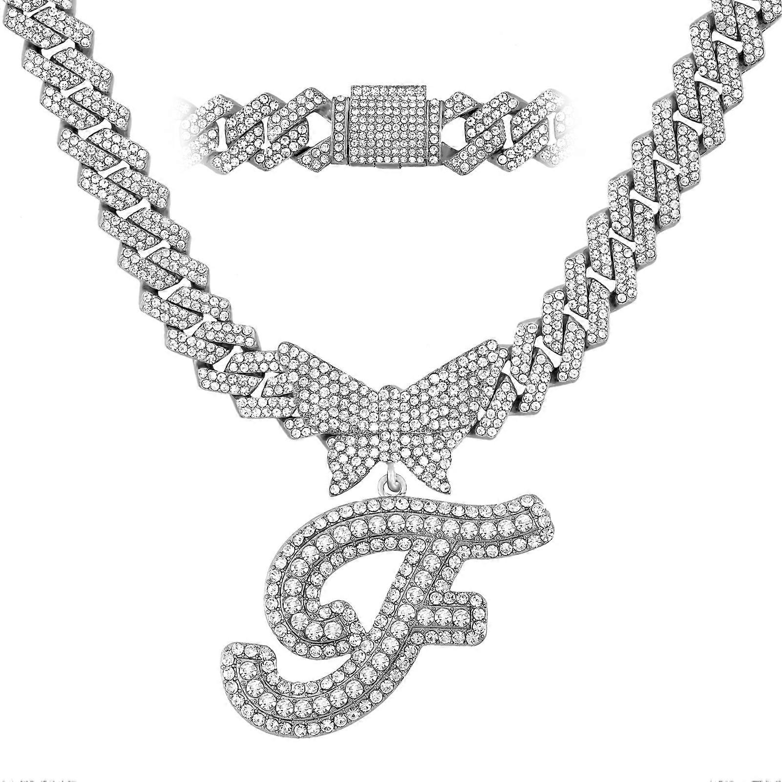 Men Women 14MM Cuban Chain Crystal Butterfly Initials Name Pendant Necklace Iced Out Cursive Letters Rapper Necklace Jewelry New