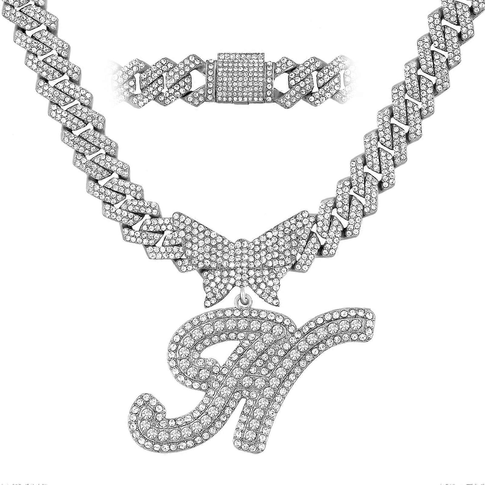 Men Women 14MM Cuban Chain Crystal Butterfly Initials Name Pendant Necklace Iced Out Cursive Letters Rapper Necklace Jewelry New