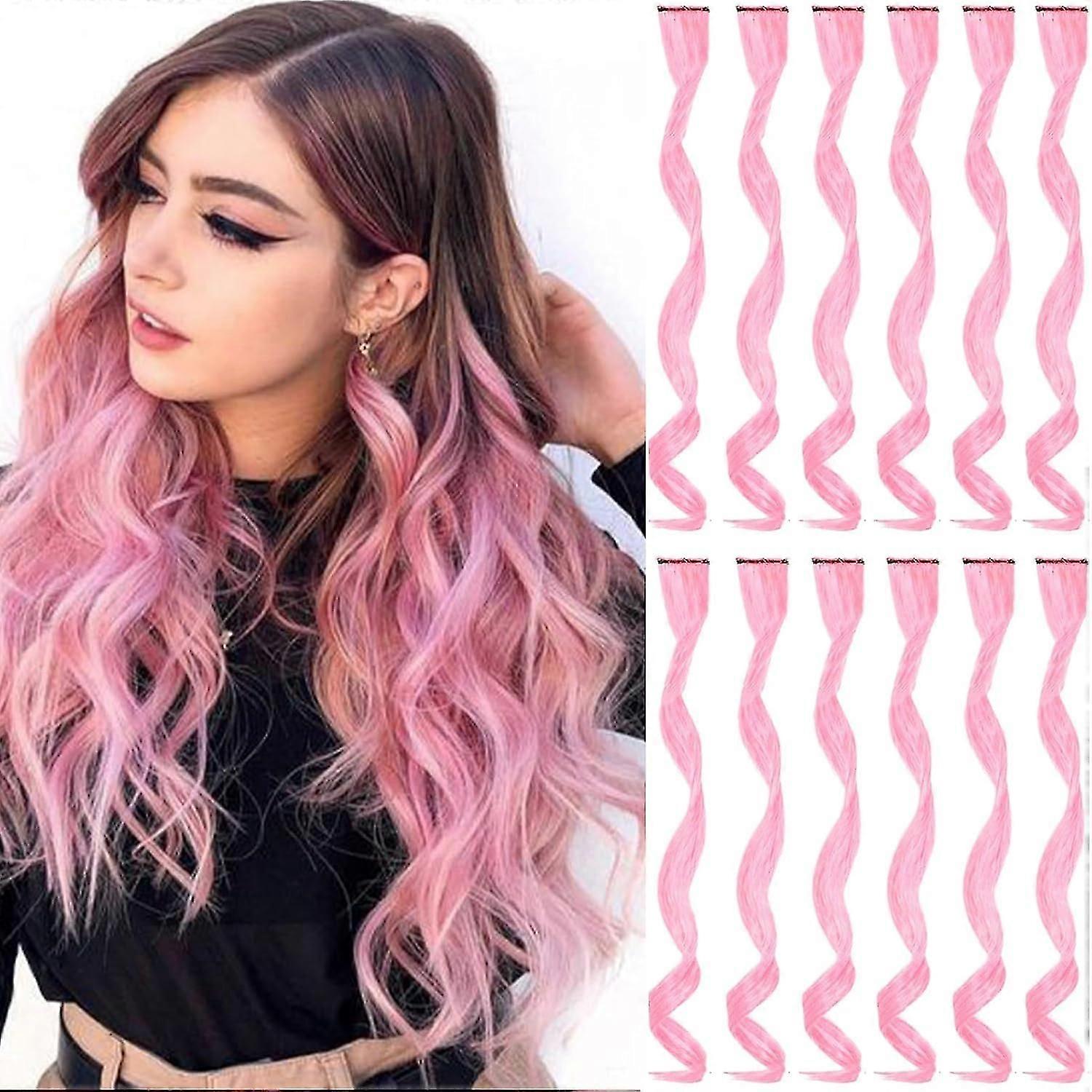 12 Pieces Curly Wavy Pink Hair Extensions, Clip-In Synthetic Highlights for Kids and Girls, 17 Inch Party Hairpiece