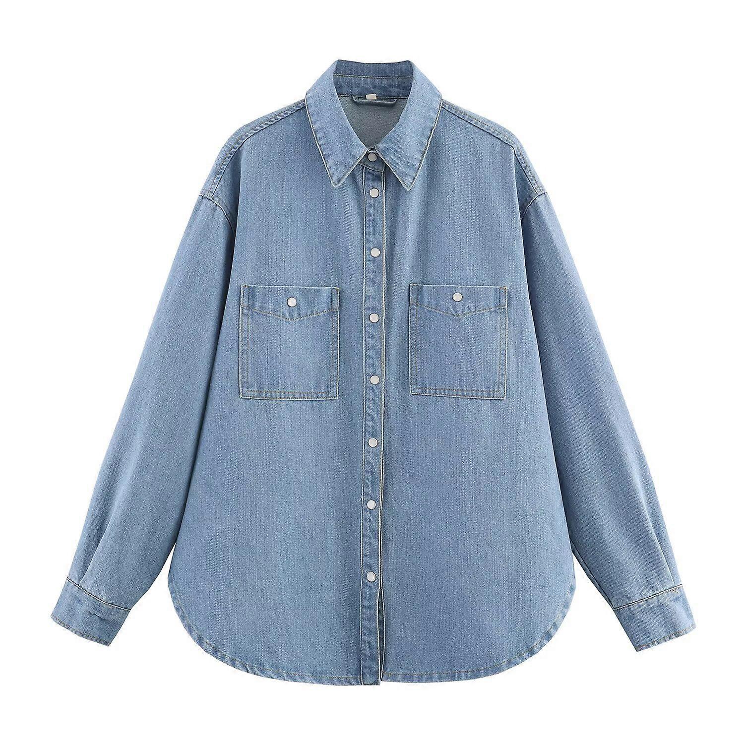 New Women's Fashion Loose-Fit Long-Sleeve Solid Color Washed Denim Shirt Jacket With Pockets