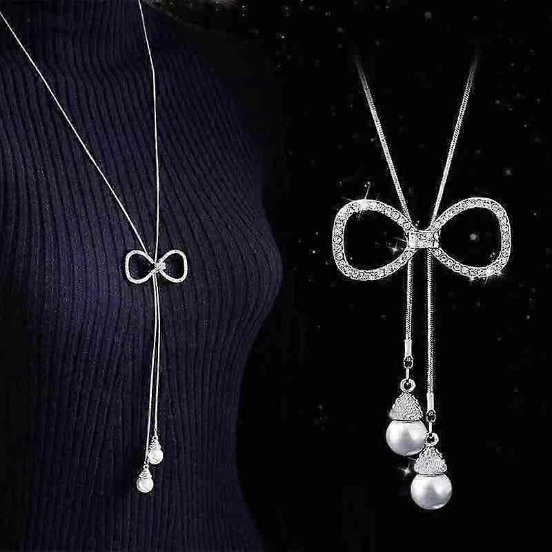 Fashion Crystal Bow Charm Sweater Chain Long Necklace Korean Tassel Zircon Rose Flower Pendant Necklace Jewelry for Women Gifts