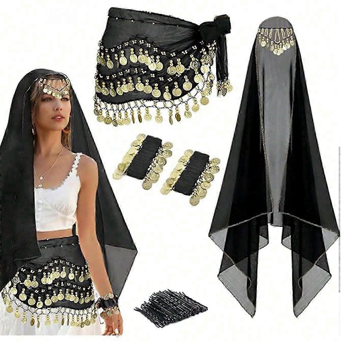 Belly Dance Costumes Halloween Indias Dance Outfits Coins Belly Dance Hip Scarf Chiffon Head Scarf,2 Coin Wrist Bracelets royal blue