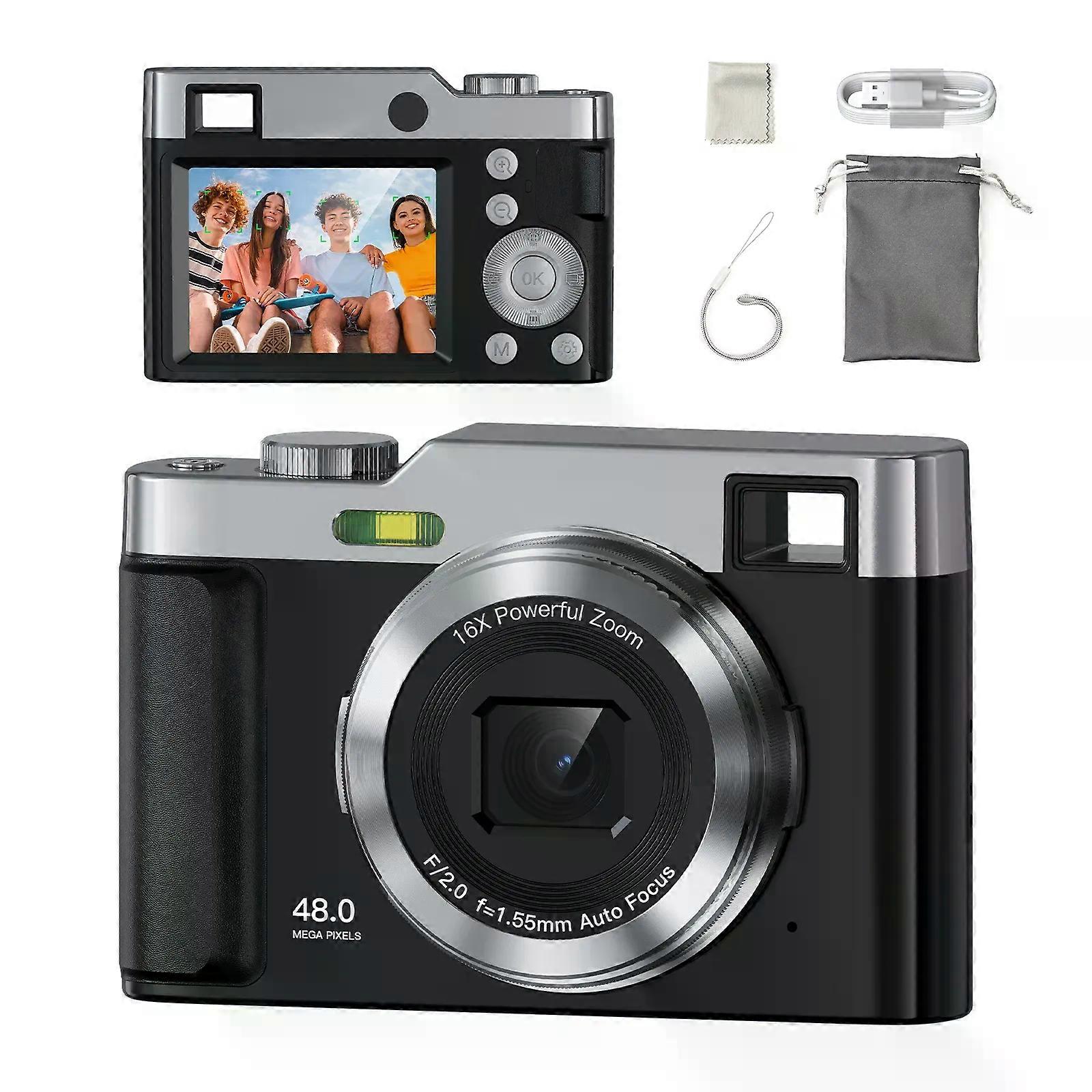 Digital Camera Camera Digital Point and Shoot Camera with 16X Zoom Anti Shake Portable Compact Camera for Teens Adult Beginner ⭐️Appearance and material: This digital camera for teens has a stylish and compact design. Made of high-quality plastic, it's lightweight for easy carrying and sturdy enough to endure various environments, accompanying you to record life's moments. ⭐️48MP camera: Capable of capturing detailed images that remain clear even when zoomed. It adapts well to different shooting scenarios, from wide landscapes and architectures to close-ups of the microscopic world. ⭐️Screen display: Equipped with a 2.4-inch IPS high-definition screen, providing a clear and vivid display for better shooting experience. ⭐️Video and image formats: Video - AVI. Image - JPG, convenient for viewing, editing and sharing on different devices. ⭐️Battery: A 1000mAh lithium battery offers long-term power support with stable voltage, ensuring reliable operation and a longer service life for your shooting needs. _x000D_