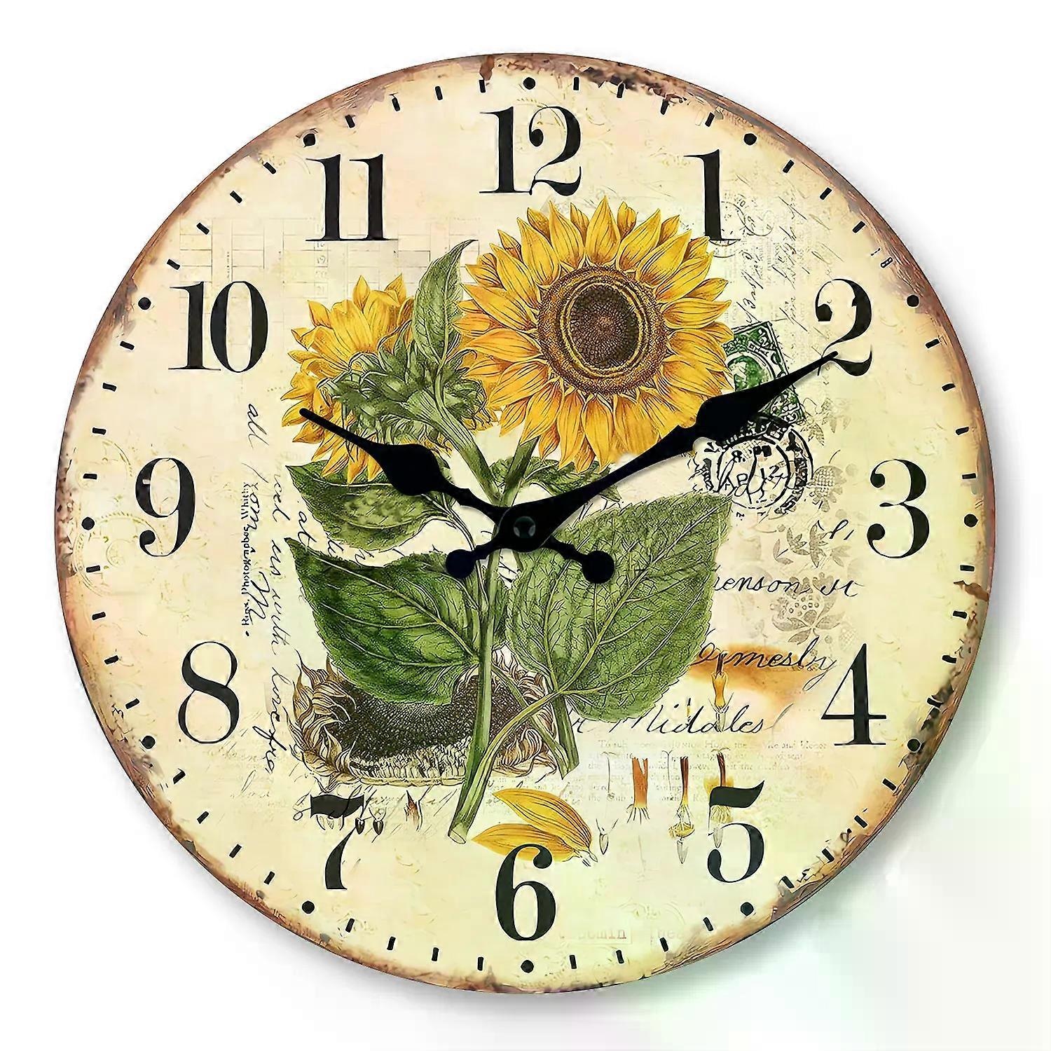 1pc retro wood wall clock two sunflower flower design wall clock non-ticking silent wall clock home living room decoration