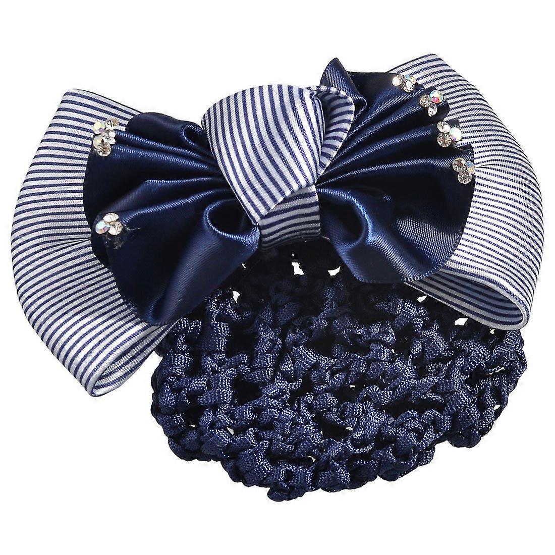 Navy Blue Rhinestone Bow Hair Snood Barrette with Elegant Ruffles and Secure Net for Women