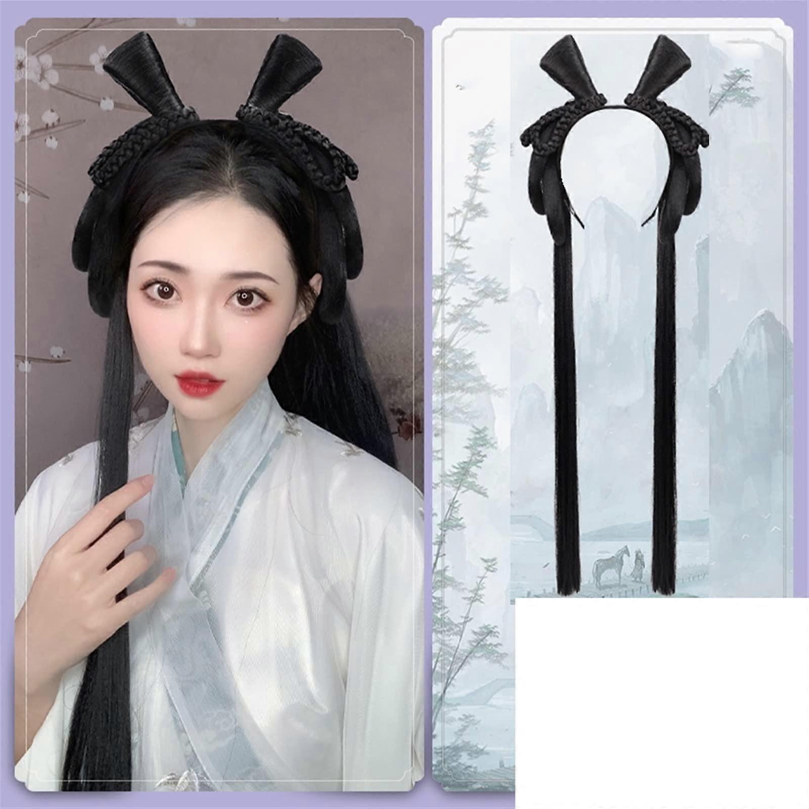 Hanfu Wig with Bangs Heat Resistant Black Ancient Chinese Croissant Hair Bun Adjustable Fit