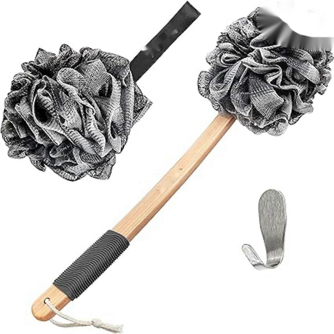 Loofah Back Scrubber with Long Handle and Bamboo Charcoal Exfoliation, Bath Pouf Set, Slate Grey