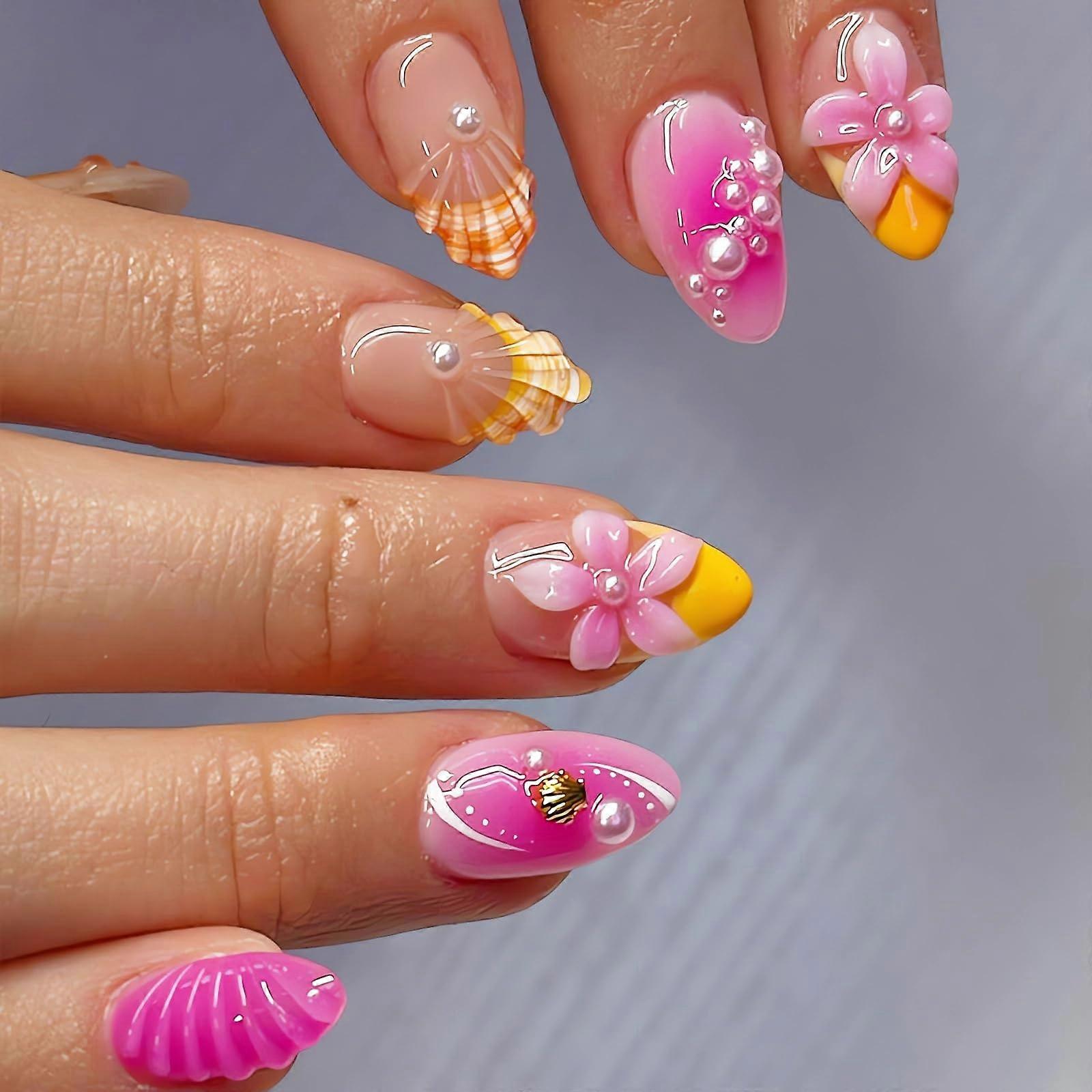 Press on Nails Almond with Pearl Design Pink Yellow French Tip Fake Nails Reusable Acrylic Set 24pcs