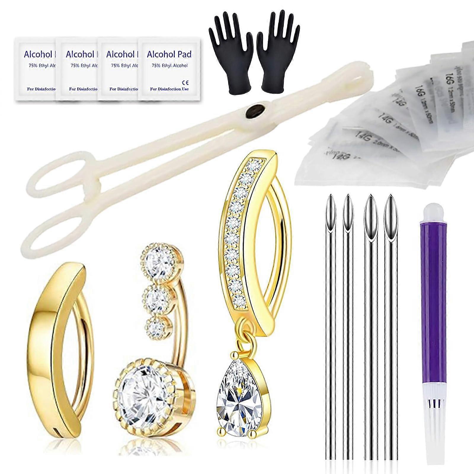 Professional Belly Button Piercing Kit Gold with Sterile Tools and Stainless Steel Navel Rings 17PCS