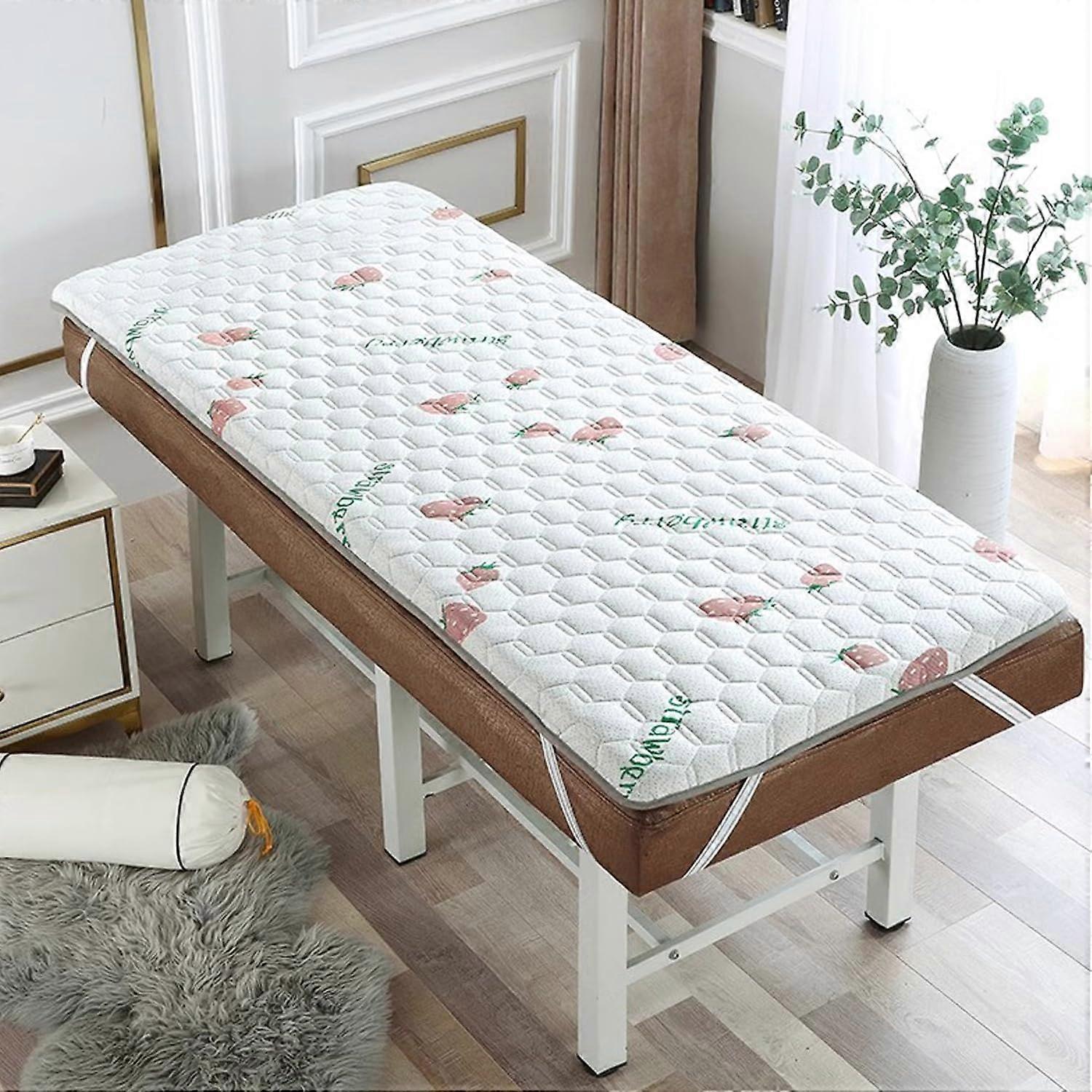 Thickened Latex and Memory Foam Massage Table Topper A comfortable, durable mattress topper designed for professional beauty and spa use. The knitted cotton surface and layered filling combine to provide consistent support and a soft resting surface during treatments. Key benefits Comfortable support: Layered latex and density memory foam provide even support for head, neck, shoulders, back and hips during treatments and massage sessions. Stable fit: Corner straps on all four corners plus an elastic band secure the topper to the table and reduce slipping. The adjustable strap design helps position and remove the topper quickly. Durable construction: Knitted cotton surface with resilient foam and latex filling resists collapse under normal use and maintains its shape over time. Ergonomic profile: Designed to support five body zones and conform to body contours for a more comfortable client experience during beauty treatments and massages. All season use: Suitable for year round use in professional environments. Specifications Fabric: Knitted cotton Filling: Latex and density memory foam Thickness: 4 cm (1.6 in) Facial breathing hole: Without hole Massage mattress head shapes: S Square Head, R Round Head, T Trapezoidal Head Colors: whiteA, whiteB, grayA, grayB, grayC, blue Sizes: 180 x 60 cm (71 x 24 in) 180 x 70 cm (71 x 28 in) 185 x 70 cm (73 x 28 in) 190 x 70 cm (75 x 28 in) 190 x 75 cm (75 x 29.5 in) 190 x 80 cm (75 x 31 in) Season: All seasons Packaging: 1 x Latex Memory Foam Massage Table Mattress Topper (Excluding Display Bed) Care and handling notes The topper is not removable for washing. Use fitted sheets or a protective cover over the topper for hygiene and easy cleaning. The product is compressed for . A dimensional variance of 1 to 3 cm may occur after unpacking and will not affect use. Color may vary slightly from photos due to lighting and display differences; this is normal and not a quality defect. Typical use scenarios Beauty salon or spa: Add a cushioned layer to treatment tables for facials, body treatments and relaxation sessions. Physiotherapy and chiropractic clinics: Provide a comfortable surface for client positioning during sessions that require table support. Health centers and massage parlors: Use as a topper on existing massage tables to refresh comfort and extend the life of the table surface. This mattress topper is supplied as a single topper suitable for professional settings where a soft, supportive surface is required.