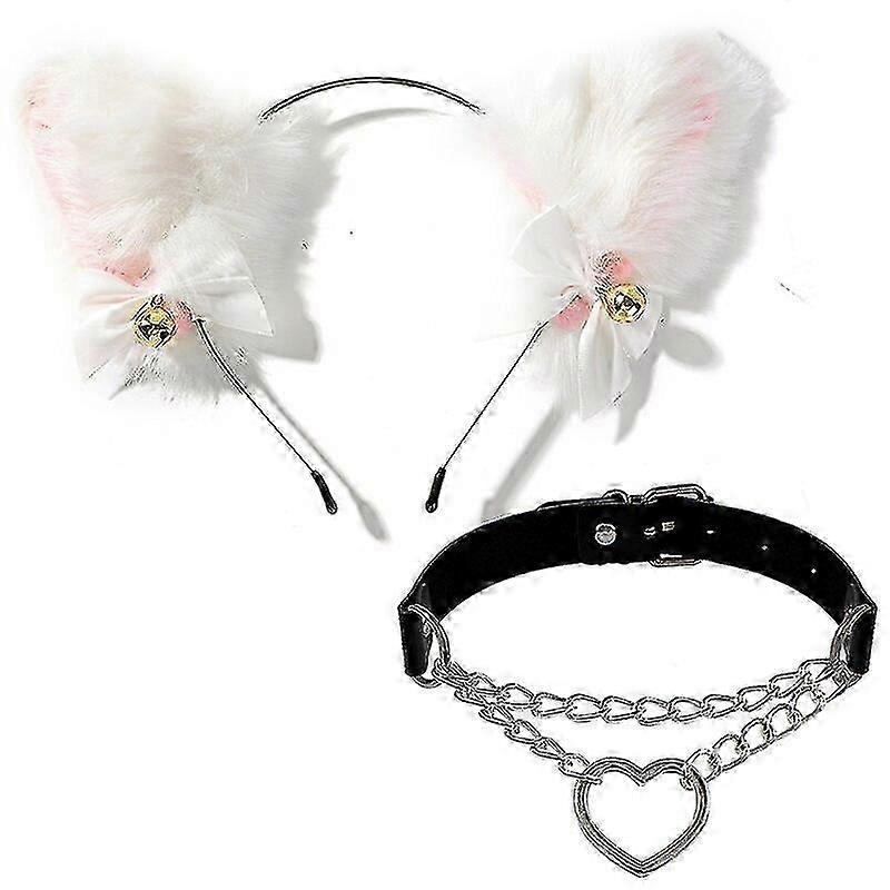 2pcs Black Cat Ear Headband With Bell Heart Chocker Necklace Girl Plush Furry Cat Ear Hair Band Wome