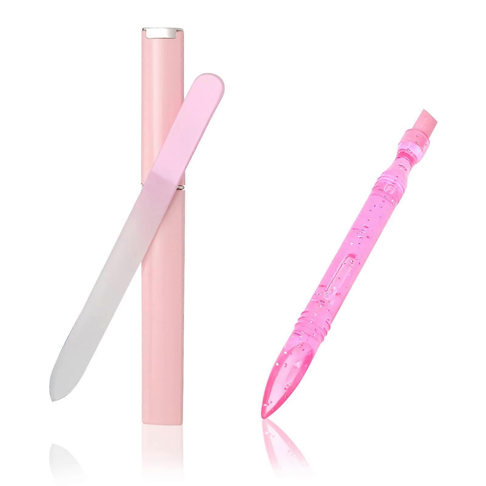 This glass nail file and cuticle pusher set includes one glass nail file, one doubleended cuticle remover tool, and a protective case. Designed for precise, longlasting nail care, the set delivers smooth filing and accurate cuticle trimming with a comfortable, durable construction. Key benefits Gentle and precise filing: Durable frosted glass surface smooths nail edges without leaving jagged edges for a neat finish. Long lasting and reliable: quality glass construction resists rust, fading, and breakage for extended use. Dualended control: Cuticle tool has pointed and slanted ends to reach tight spots, trim excess cuticle, and clean under the nail. Portable and protected: Included case stores tools safely for travel or daily carry. Easy to clean and reuse: Washable under water for simple maintenance and repeated use. How it solves common problems Replaces disposable files that wear down quickly by offering a durable surface that stays effective. Reduces rough edges and splitting with consistent, even filing. Reaches hardtoaccess areas around and under nails with the doubleended design for cleaner results. Practical uses Athome manicure: Smooth and shape natural nails before applying polish or oil. Travel grooming: Compact case makes it simple to carry for quick touchups on the go. Salon or professional touchups: Precise cuticle shaping and undernail cleaning for detailed work. Materials and care Material: quality glass for both file and cuticle tool. Care: Rinse under water, dry before storing in the case to maintain condition. What you get 1 glass nail file 1 doubleended cuticle remover tool 1 protective storage case This set offers a simple, durable solution for clean, wellshaped nails whether at home, on the move, or in a professional setting.