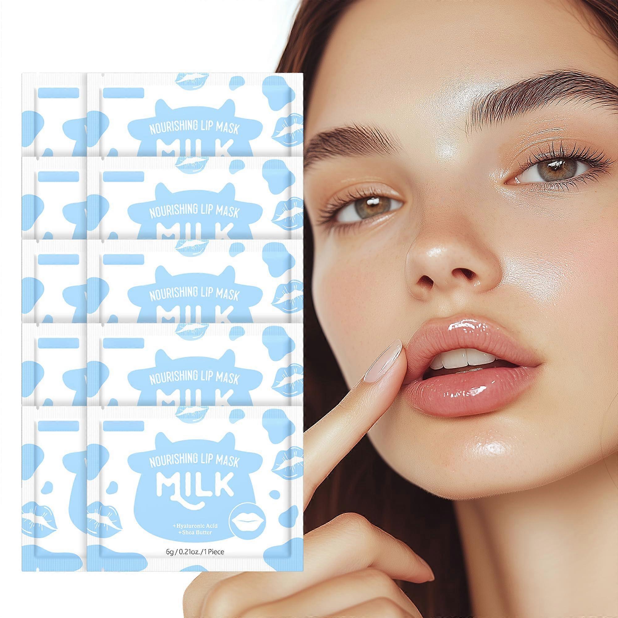 Milk Nourishing Lip Mask 10 Pieces Product overview A crystal white gel lip mask infused with collagen serum and plant extracts to moisturize and condition lips. Each pack contains 10 singleuse masks. Designed for quick application and easy absorption to help improve lip texture and comfort. Key benefits Deep hydration and conditioning: Collagenenriched serum and moisturizing agents help replenish surface moisture and soften dry lips. Smoother lip texture: Formulated to reduce the appearance of fine lines and improve overall smoothness when used regularly. Easy to use and fastabsorbing: Lightweight gel formula absorbs with a short massage, leaving lips ready for makeup or overnight care. Natural plant essences: Contains plantderived ingredients including hyaluronic acid, shea butter, and vitamin E to provide a nourishing feel. How to use 1. Cleanse lips and dry gently. 2. Apply the lip mask evenly and leave on for 15 to 20 minutes. 3. Remove the mask and gently massage remaining essence into the lips to aid absorption. For results, use before bedtime. Product features and attributes Quantity: 10 pieces per pack. Formulation: Gel lip mask with collagen serum and plant essences. Function: Moisturizing, nourishing, smoothing, and conditioning lips. Application: Singleuse masks for targeted lip care; suitable for use before makeup or as part of a nightly routine. Practical use scenarios Premakeup prep: Apply before lipstick to create a smoother base and improve makeup application. Overnight conditioning: Use before sleep for overnight moisturizing and to refresh lip texture by morning. Travel or dry environments: Keep a pack for use during flights or in dry climates to maintain lip hydration. Notes Avoid contact with eyes. For external use only. Follow directions for results.