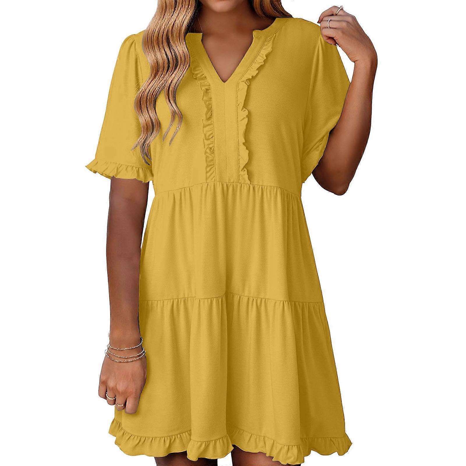 Womens Summer Dresses 2025 V Neck Short Sleeve Casual A Line Flowy Swing Holiday Dress Mini Dress Yellow XL