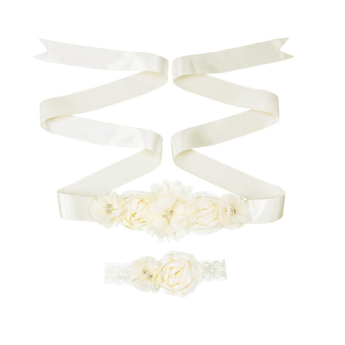 Flower Girl Sash Belt for Wedding 2Pcs Pearl Rhinestone Satin Ribbon Headband Set