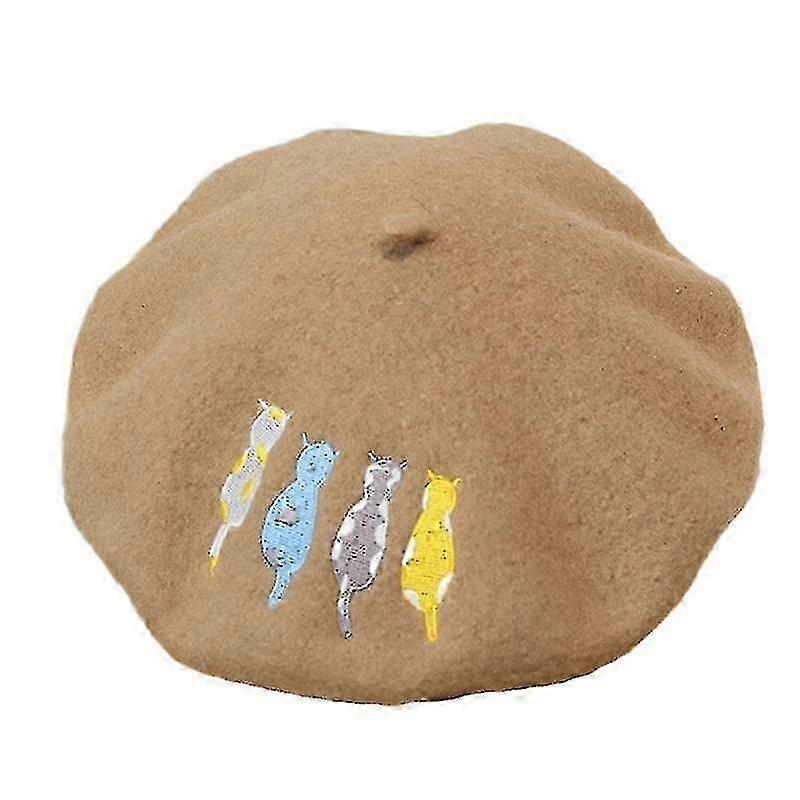 Cute four-cat embroidered beret, painter's hat, winter essential, women's/girls' style, Camel