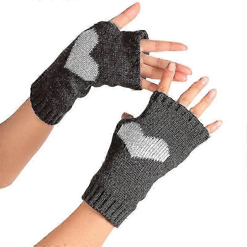 Women's Winter Touchscreen Thickened Warm Knitted Gloves, Heart Print Fingerless Mimics, Outdoor Ski Gloves, Dark Gray