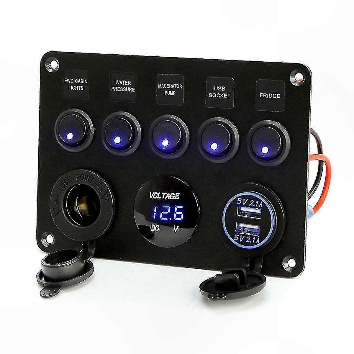 [All-in-One Switch Panel Solution] Designed for maximum convenience and versatility, this switch panel features 5 ON-OFF LED toggle switches, 12V/24V lighter sockets, a dual USB charger (5V, 2.1A each), and an LED digital voltmeter. Ideal for circuit control, device charging, and voltage monitoring. [Advanced Water and Safety Protection] The switch panel is IP65 rated for water resistance and includes protection against overheating, overcurrent, overload, undervoltage, and short circuits. [Wide Application and Effortless Installation] Compatible with 12V–24V DC systems. Suitable for cars, UTVs/ATVs, trucks, trailers, RVs, caravans, buses, marine boats, yachts, and aircraft. Includes pre-wired connections, mounting screws, and labeled switches for straightforward installation. Specifications: 1. SPST ON-OFF toggle switch 2. Rated voltage: 12V / 20A or 24V / 10A 3. LED indicator: 1 per switch 4. Operating voltage: 12–24V DC 5. Dual USB output: 5V, 2.1A per port 6. Voltage display range: DC 5–30V 7. Commonly used in boats, RVs, trucks, motorcycles, and travel trailers Note: Installation guide not included. Professional installation is recommended. Please verify compatibility before purchase. Product design and color may vary slightly between batches. These variations do not affect functionality. LED indicator colors: Blue / Red / Green Color: As shown Material: Plastic Package Contents: 1 x Switch Panel Note: Screen settings and lighting conditions may cause slight color differences between images and the actual product. Measurement tolerance: ±1–3 cm.