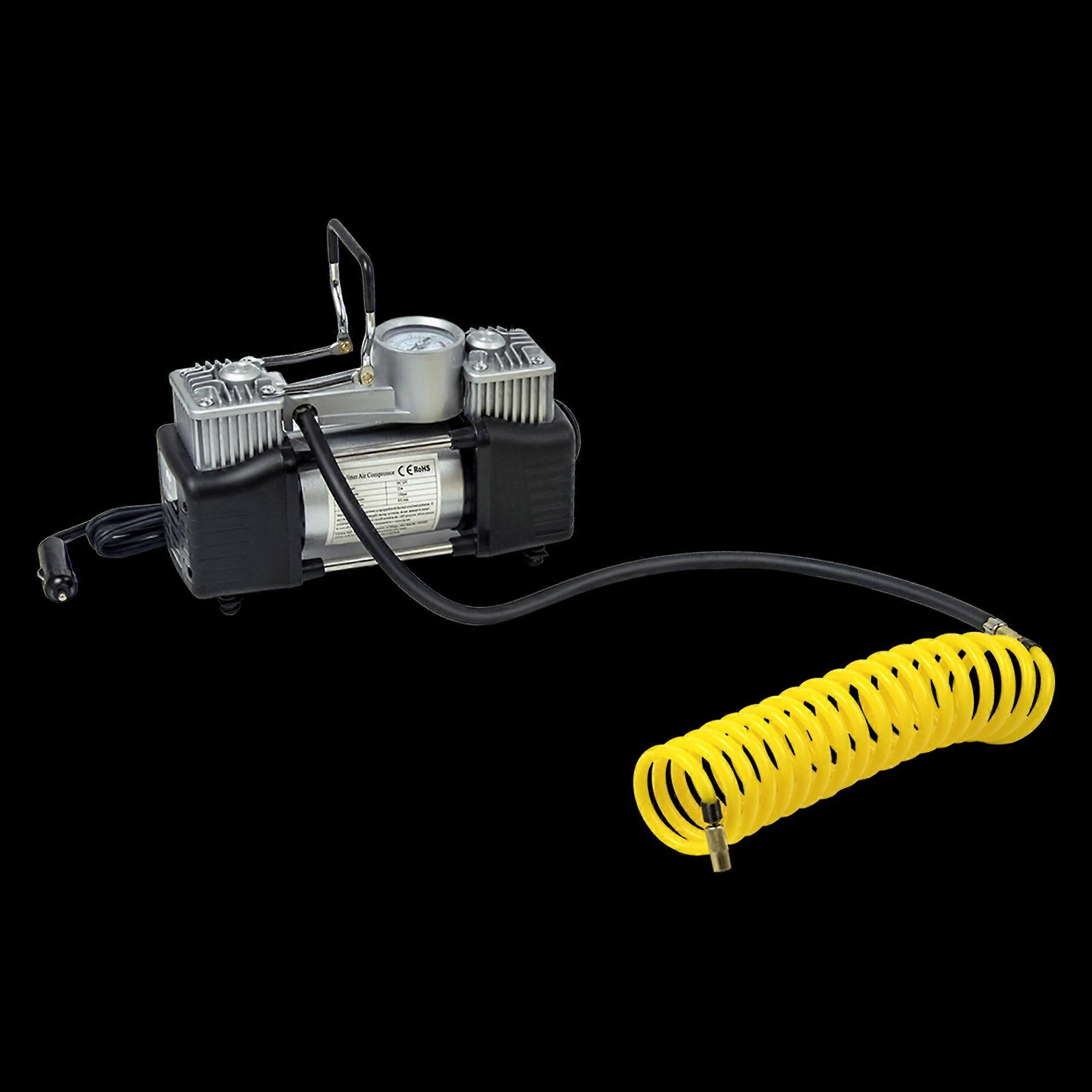 Material: Double-Alloy Steel Cylinder Blocks Pu Hose And Chrome Plating Connector Colour: Black And Yellow Dimensions: 24.5 X 9.5 X 19Cm L X W X H Accessories: Carrying Bag Regular Air Hose Coiled Air Hose Power Cord 2 Battery Clamps 3 Nozzle Adaptors Deflation Valve Tyre Plug Kit In-Line 30-Amp Fuse And Users' Manual Voltage: Dc 12V Maximum Airflow: 85L/Min Maximum Pressure: 150 Psi Can In
