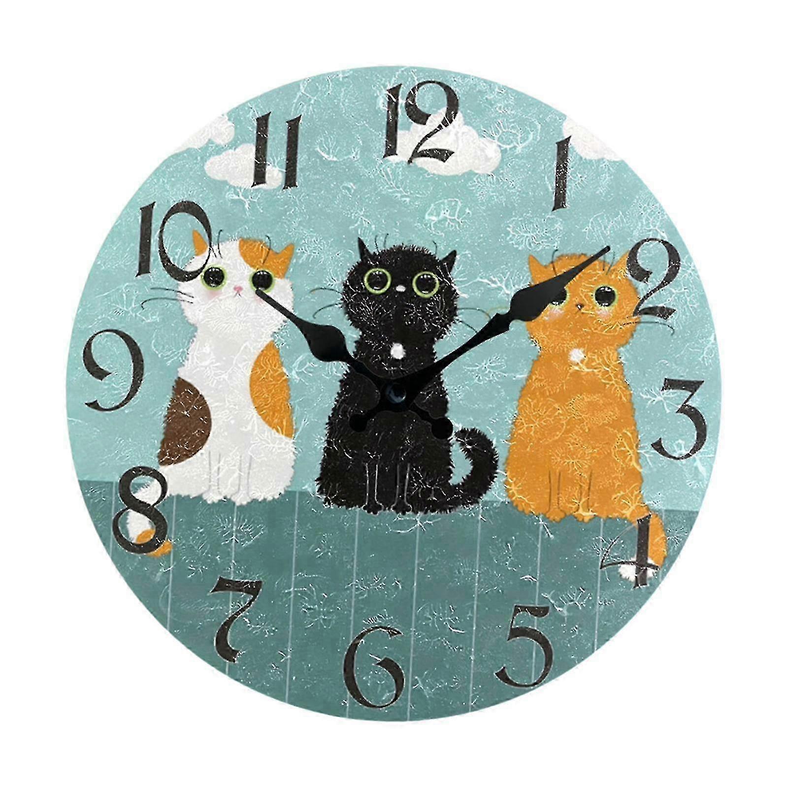 Cute Design: Funny cat wall clock features large Arabic numerals and cute cat patterns, unique and interesting, adding a touch of vivid color to your space.Decorative Wall Clock: Wall decorative clock adopts a silent scanning operation mechanism, no need to worry about noise interference, making your life quieter and more comfortable.Easy To Install: The round wall clock comes with a hanging hole to ensure convenient installation and easy hanging.Wide Application: Silent round wall clock is suitable for living room, bedroom, kitchen, bathroom, office, restaurant, cafe, library, farmhouse, etc.Practical Gift: Hanging clock is an ideal gift for family and friends on birthdays, housewarming, weddings or other special occasions. Specification: Material: High Density FiberboardProduct Size: 30cm/11.81inch Package Includes: 1 Funny Cat Wall Clock Note: Please allow slightly errors 1-2cm differences due to manual measurement. Note: Due to the light and screen setting difference, the item's color may be slightly different from the pictures. Please allow slight dimension difference due to different manual measurement.
