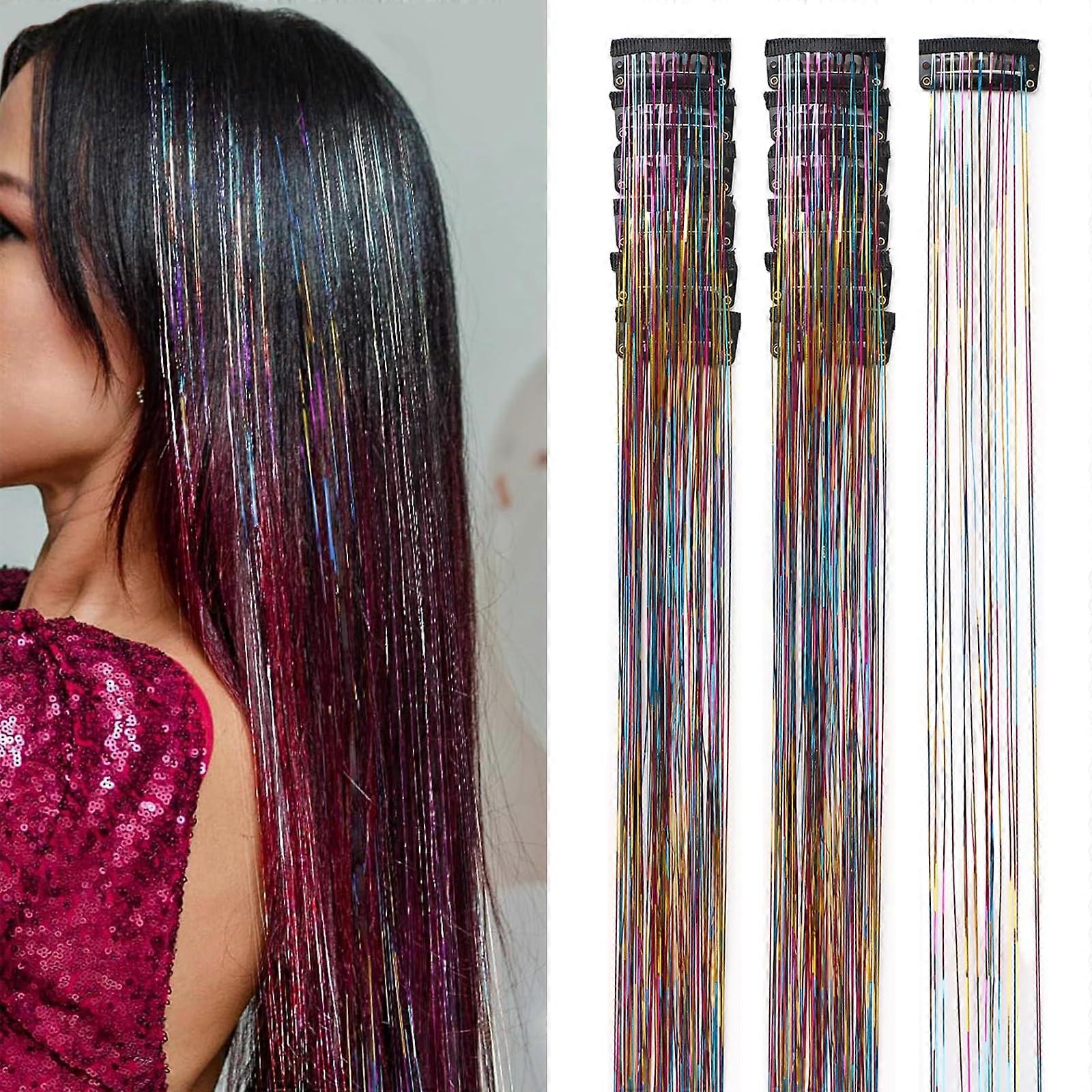 Hair Tinsel Clip In Extensions 12 Pcs 20.5 Inch MultiColor Glitter Heat Resistant Strands for Women Girls