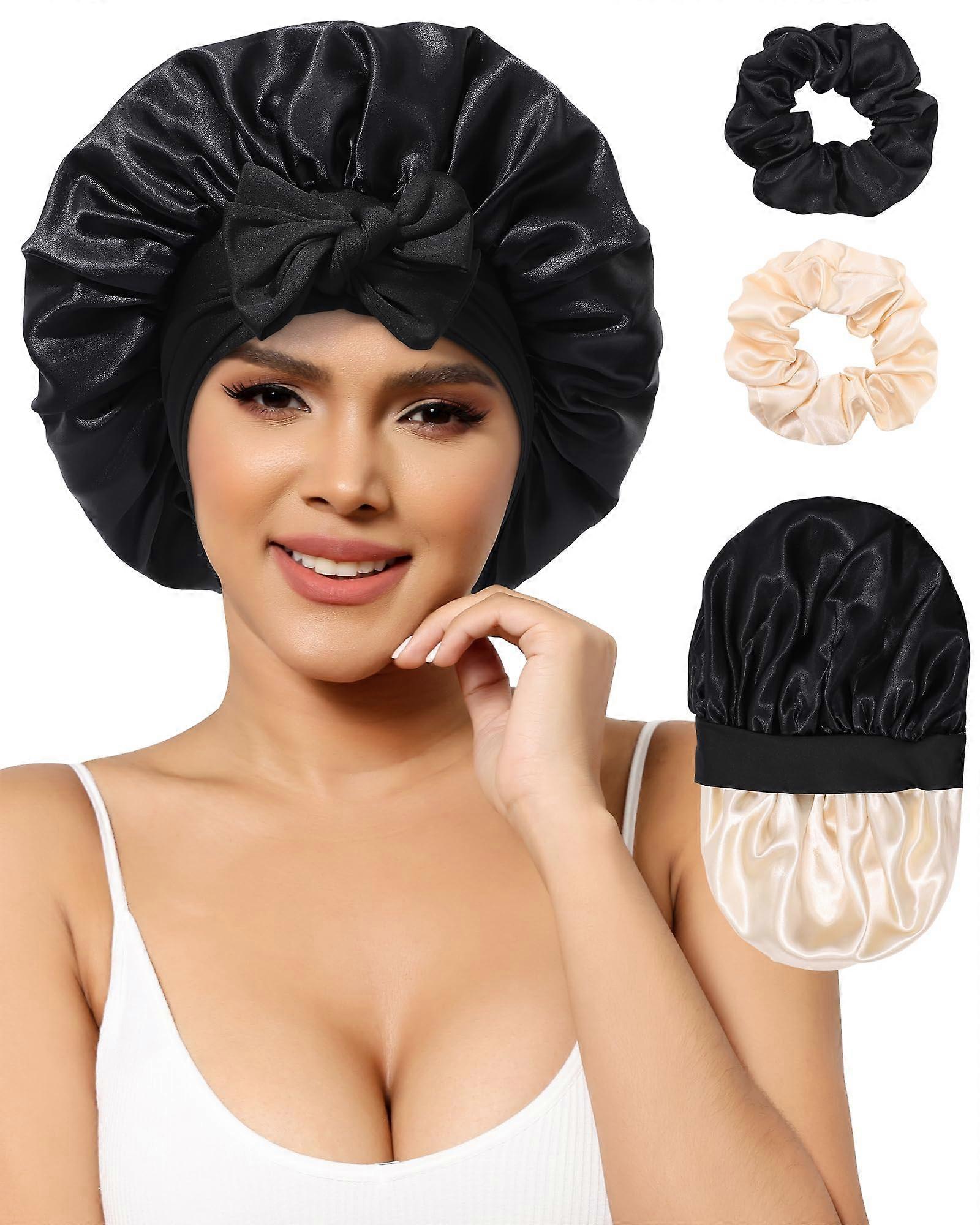 Silk Hair Bonnet for Curly Hair Sleeping, Reversible Satin Sleep Cap with Adjustable Tie Band