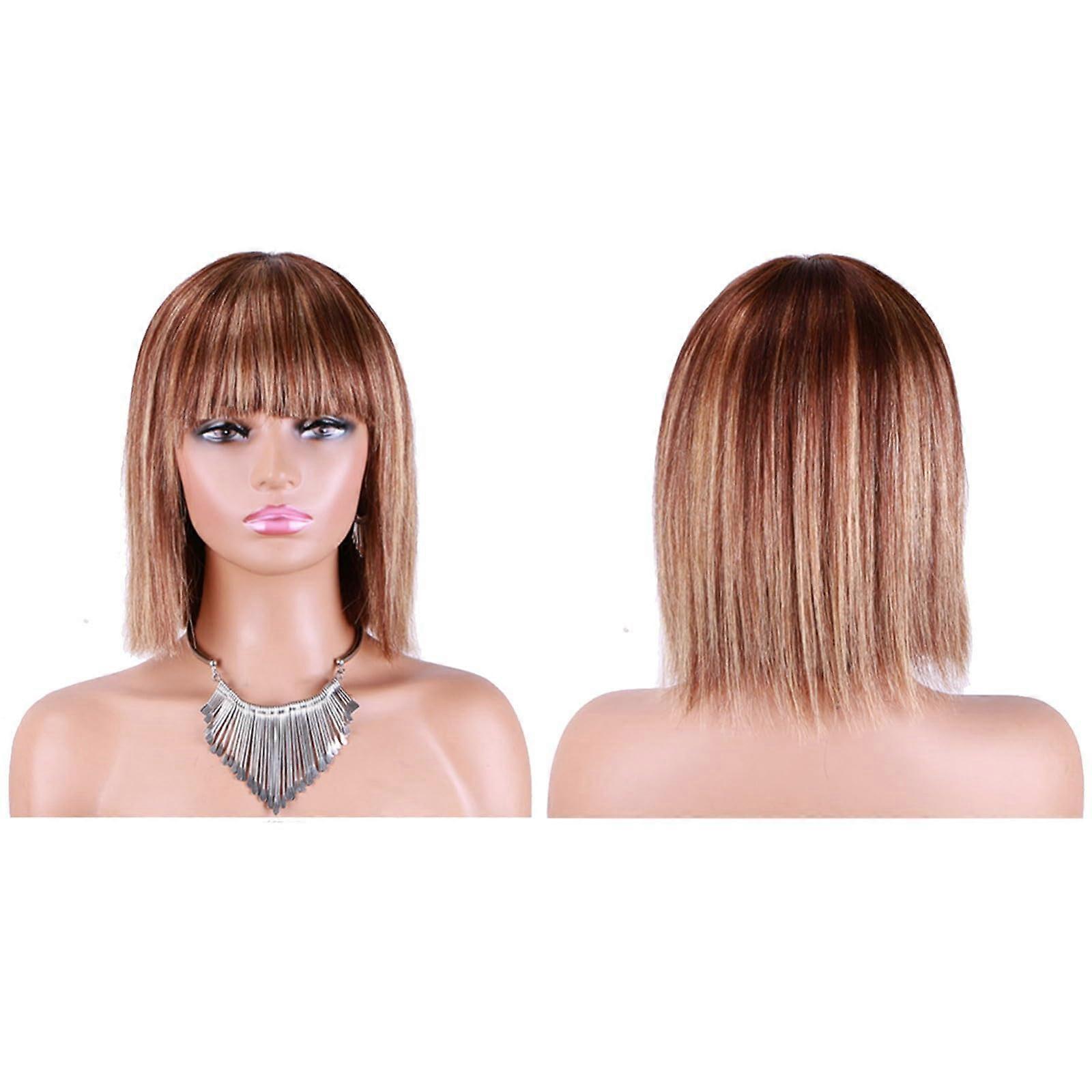 Human Hair Bob Wig Honey Blonde with Bangs, Short Straight Glueless Highlight for Black Women 10in