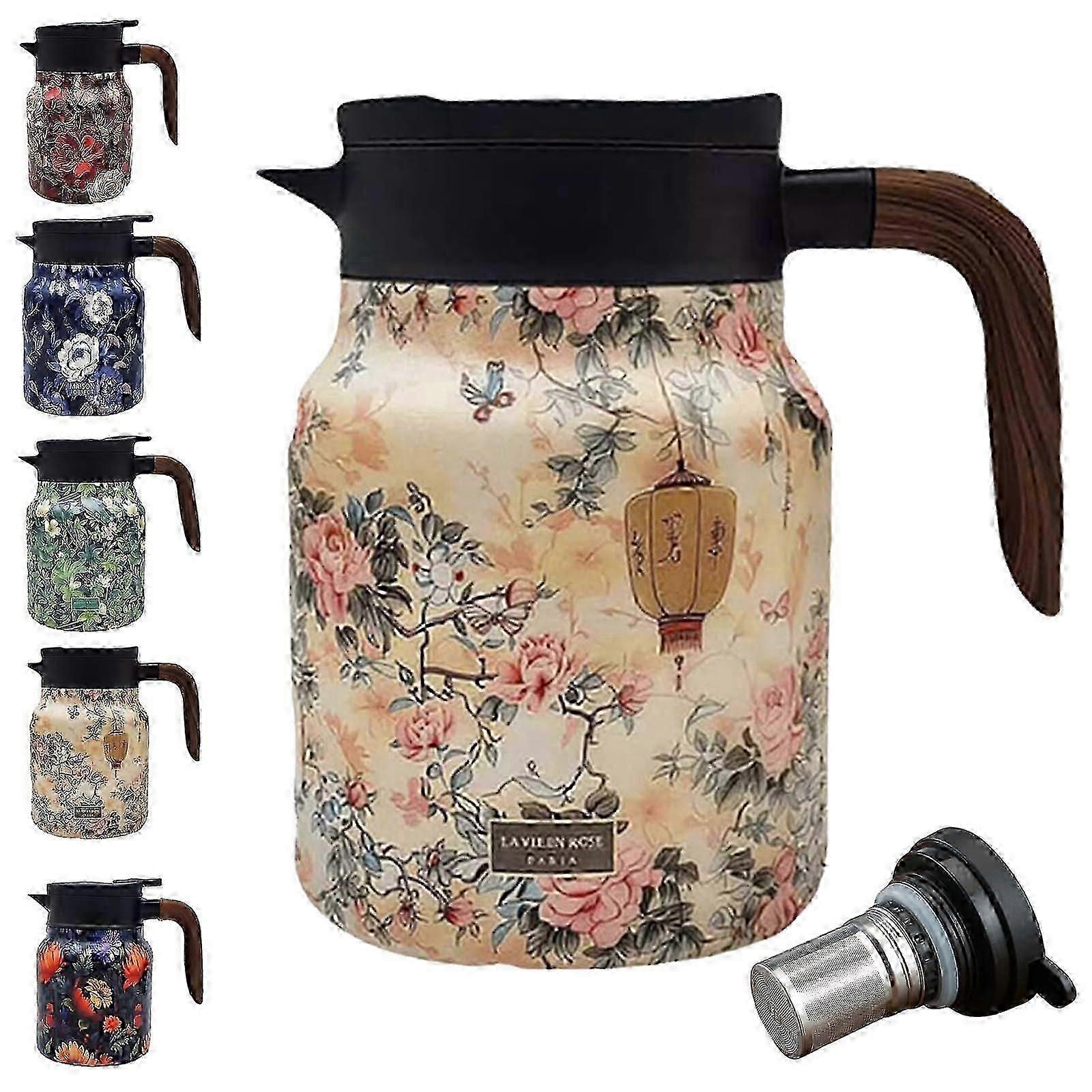 Vintage Floral Tea Thermos with Infuser, 1000ml Stainless Steel Thermal Carafe for Hot Drinks