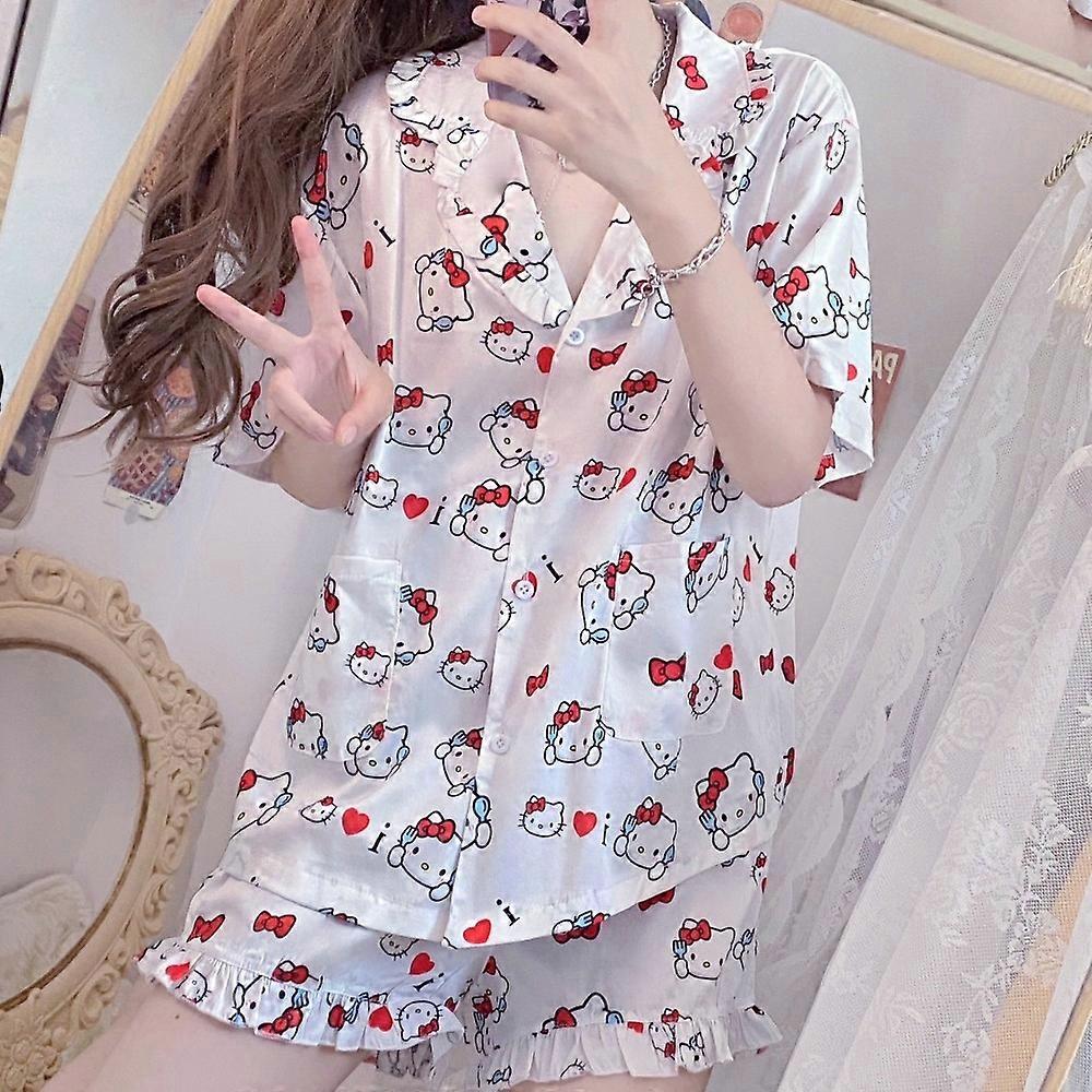 Anime Summer Woman Pajama Set Cartoon Hello Kitty��My Melody And Kuromi Printing Shirt Shorts Homewear Suit Student Nightwear