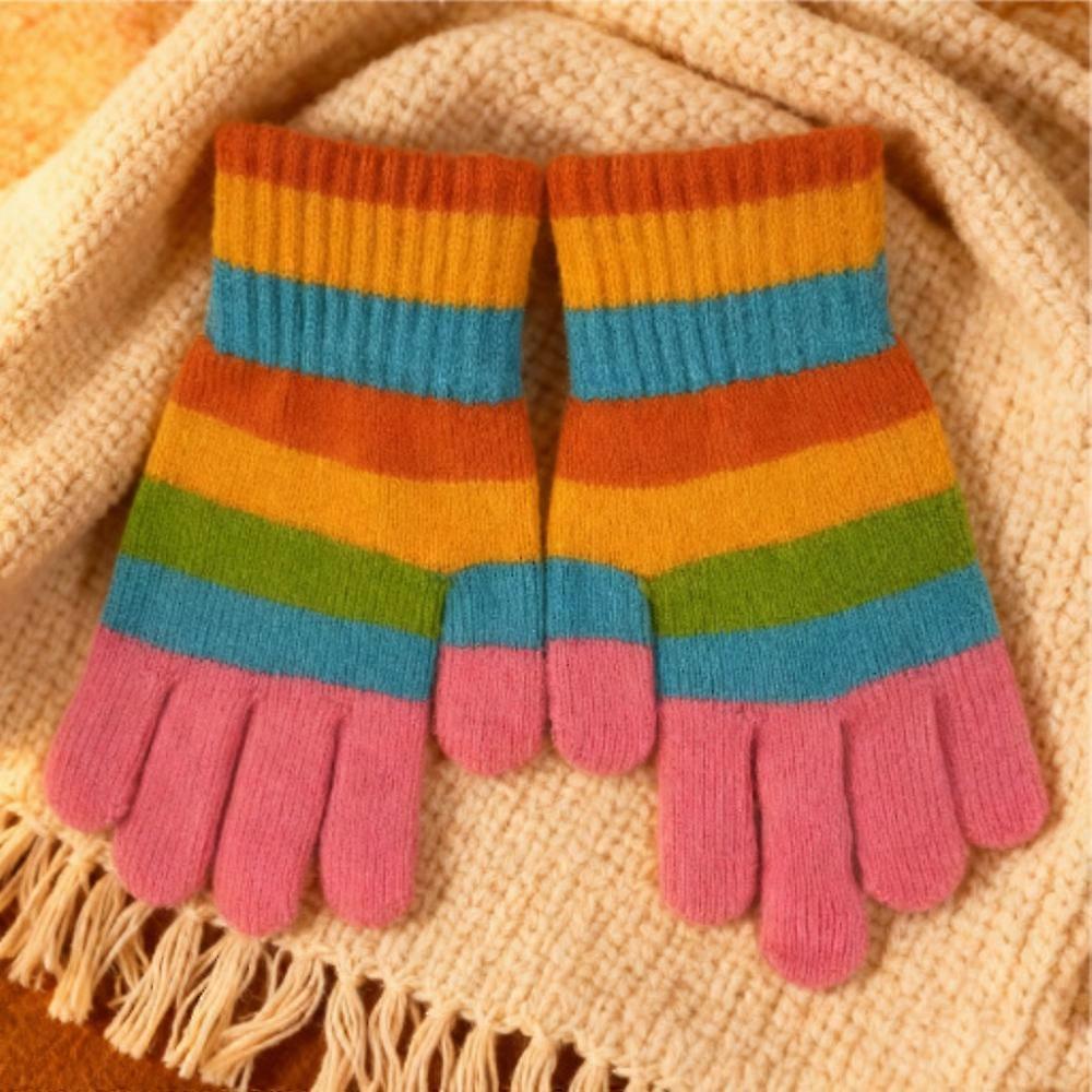 A Pair Touchscreen Rainbow Striped Gloves Striped Design Warm Knit Gloves Thickened Stretchable Half-Finger Gloves Winter Season