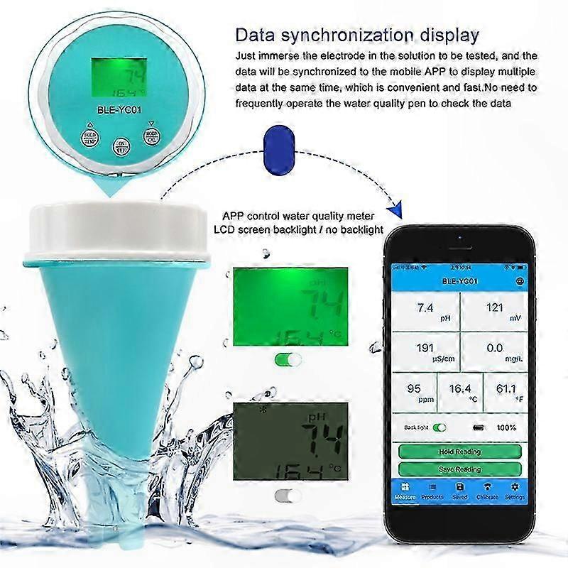 Feature: 1. 6-in-1 Meter with Bluetooth Connectivity: Compatible with mobile apps to measure pH, ORP, free chlorine, EC, TDS, and temperature. Suitable for drinking water, hydroponics, laboratories, and aquariums. 2. Cloud Data Management: Enables real-time Bluetooth data transmission with clear, accurate readings. Save, manage, and share measurements easily via the app. 3. Automatic pH Calibration: Features a high-sensitivity glass electrode and five-point calibration (using included calibration solutions: pH 4.00, 6.86, 7.00, 9.18, and 0.01). 4. Comprehensive Display: Immersing the electrode in solution delivers fast, simultaneous multi-parameter readings on the app. Backlight is controlled via the mobile app. 5. High-Precision Water Quality Testing: Equipped with an advanced algorithm chip and optimized electrode for fast, accurate response. Green backlight LCD ensures readability in all lighting conditions. Specifications: pH Range: 0.1–14.0 pH Resolution: 0.1 pH Accuracy: ±0.1 Temperature Range: 0.1°C–80.0°C (31.2°F–176°F) Temperature Resolution: 0.1°C / 0.1°F Temperature Accuracy: ±0.5°C EC Range: 0–1999 µS/cm, 10.01–20.0 mS/cm, 2000–10000 µS/cm EC Resolution: 1 µS/cm, 10 µS/cm, 0.01 mS/cm EC Accuracy: ±2% F.S. TDS Range: 0–999 ppm, 1000–9990 ppm TDS Resolution: 1 ppm, 10 ppm TDS Accuracy: ±2% F.S. Free Chlorine Range: 0.1–4.0 mg/L Free Chlorine Resolution: 0.1 mg/L ORP Range: ±999 mV ORP Resolution: 1 mV ORP Accuracy: ±15 mV Power: 3 × AAA batteries (not included) Display: LCD digital display Backlight: App-controlled Temperature Compensation: Automatic